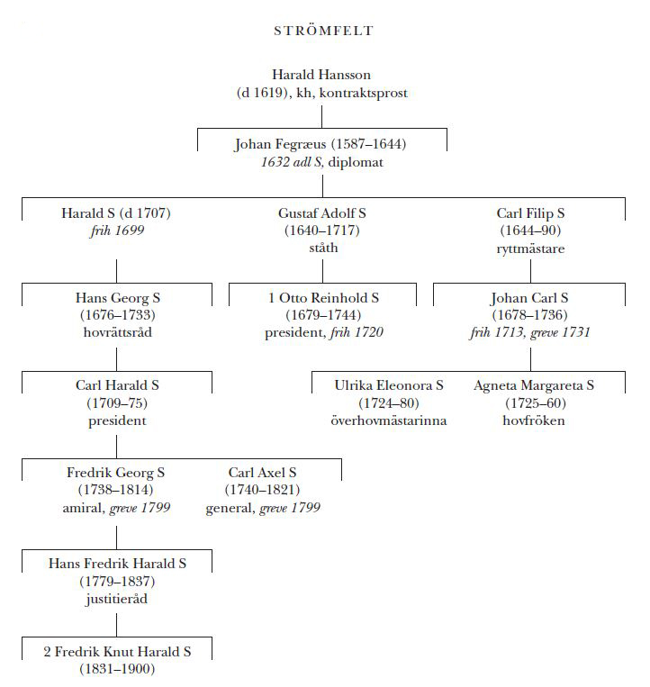 Strömfelt, släkt, härstammande från kyrkoherden och kontraktsprosten Harald Hansson (d 1619) i Fägre församling i nordöstra Västergötland. Bland hans barn, som efter födelseförsamlingen kallade sig Fegræus (bd 15, s 446–48), fanns äldste sonen Johan Fegræus (1587–1644) som 1632 adlades med namnet S. Han inskrevs 1609 vid UU och nämns två år senare som politices studerande där, ett ämne i vilket Johannes Messenius (bd 25) innehade lärostolen. Då S senare nämner Axel Oxenstierna (bd 28) som sin ”patron och befordrare” (Ämbets-bref…, s 120) är det möjligt att han under, eller efter, studierna inträtt i något slags tjänsteförhållande till denne. S utsågs i början av 1624 till sekreterare vid det kungliga kansliet, och även om han samma år erhöll ett stenhus i Sthlm för sina tjänster (RR) så kom han till stor del att vara förlagd på tyskt eller baltiskt område fram till dess att han 1629 efterträdde Jonas Bure (bd 6) som svensk agent i Helsingör, detta med lön och förtäring samt bibehållen sekreterarlön. Året därpå förhandlade S med det franska sändebudet Charnacé om det svensk-franska förbundet. Han hade en framskjuten position vid fredsförhandlingarna med Danmark i mars 1634 men först 1638 utnämndes han till svensk resident i Danmark, en post han innehade till krigsutbrottet 1643 då han hemkallades. S har karaktäriserats som en man av ”stor vakenhet och användbarhet”; det vilade dessutom ”lugn och pålitlighet över hans framfärd” (Ahnlund 1940, s 356 f).