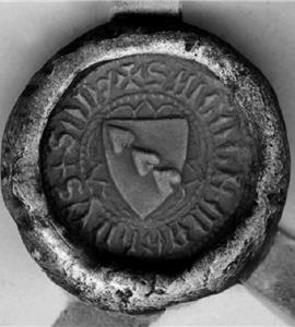 Sture (sjöbladsätten). Vapenbilden med tre balkvis ordnade sjöblad har under 1300-talets förra hälft kunnat beläggas för Anund S (d 1360 eller 1361) och för riksrådet Gustaf Tunason (Ving-ätten), av vilka den förre beseglat två brev 1350. Tillnamnet S användes vid denna tid även av en Rörik S (d tidigast 1357) vars vapenbild var ett gumsehuvud, och åt vilken Anund S beseglade ett brev 1343. Namnet tyder på att denne Rörik S var ättling till riddaren Rörik S (d tidigast 1312), som 1310 förekommer bland hertig Eriks löftesmän. Det förefaller sannolikt, att Anund S på fädernet tillhörde samma ätt som Rörik S och upptagit sjöbladsvapnet från Ving-ätten, från vilken han kan ha härstammat på mödernet (Carlsson).
