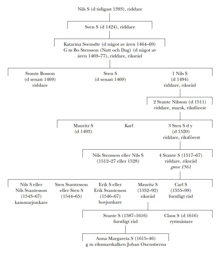 Den sistnämnde och hans ättlingar förde trots släktnamnet ej hans morfars vapen, spets nedifrån, utan sin fädernesläkts delade sköld. Hans son riksföreståndaren Svante Nilsson (S 2) blev far till de tidigt avlidna sönerna Mauritz S (d 1493) och Karl samt riksföreståndaren Sten S den yngre (S 3).