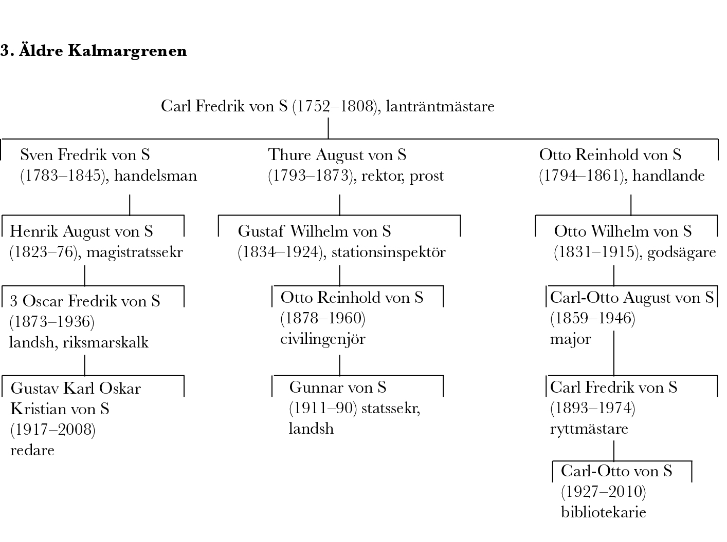 Stamfader till 3) ”Äldre Kalmargrenen” var en tredje son till Christian Fredrik von S, lanträntmästaren i Kalmar län Carl Fredrik von S (1752–1808). Sonsons son till denne var Oscar Fredrik von S (S 3), vars son var Gustav Karl Oskar Kristian von S (1917–2008). Denne lämnade 1938 Handelshögskolan i Göteborg med en civilekonomexamen och anställdes följande år i Broströmkoncernen, som han kom att ägna hela sitt yrkesverksamma liv. Han stod familjen Broström nära även privat; hans hustru Marie-Christine Broström var deras nära släkting. Kristian von S tjänstgjorde 1939–50 vid Svenska orientlinjen, och var i slutet av perioden representant för den så kallade sjöfartskommittén som bevakade svenska intressen i USA då Marshallplanen igångsattes. 1950–76 var han verksam vid Svenska ostasiatiska kompaniet, de sista tio åren som VD. Samma position fick S vid Broströms rederi 1969, där han också var styrelsens ordförande, samt vid koncernens moderbolag Ångfartygs ab Tirfing, då han efter en flerårig maktkamp ersatte Dan-Axel Broström som under en längre tid varit oförmögen att leda rederiet effektivt.