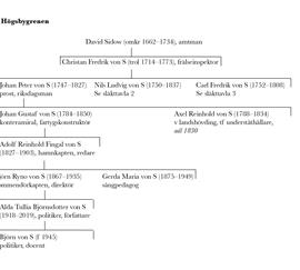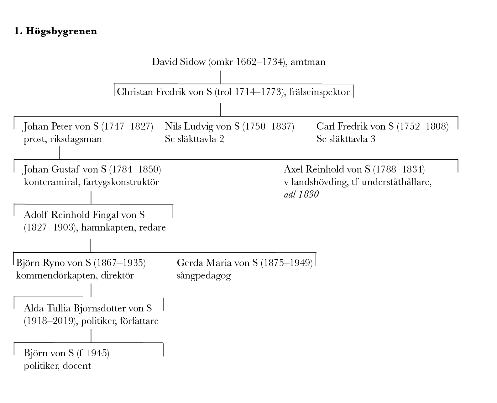 Stamfader till 1) ”Högsbygrenen” var S:s näst äldste son Johan Peter von S (1747–1827), kontraktsprost och riksdagsman för prästeståndet. Son till honom och Charlotta Elisabeth Rudbeck var Johan Gustaf von S (1784–1850), som 1802 inledde sin karriär som sjöofficer. Han deltog i krigen mot Norge 1808 och 1814 samt det oblodiga kriget mot England 1811 och medaljerades för deltagandet i det förstnämnda. 1805–24 tjänstgjorde S vid Göteborgs station, och blev 1825 tygmästare i Stockholm. Två år senare förordnades han till varvschef. Som sådan deltog han i flera statliga kommittéer rörande framför allt det sjömilitära försvaret. Han ägnade sig åt förbättringar av artilleriet, och har givits äran av den höga nivå detta uppnådde. På befattningen som varvschef, från 1849 även som stationsbefälhavare i Stockholm, förblev han till sin död. Han hade 1844 utnämnts till konteramiral.