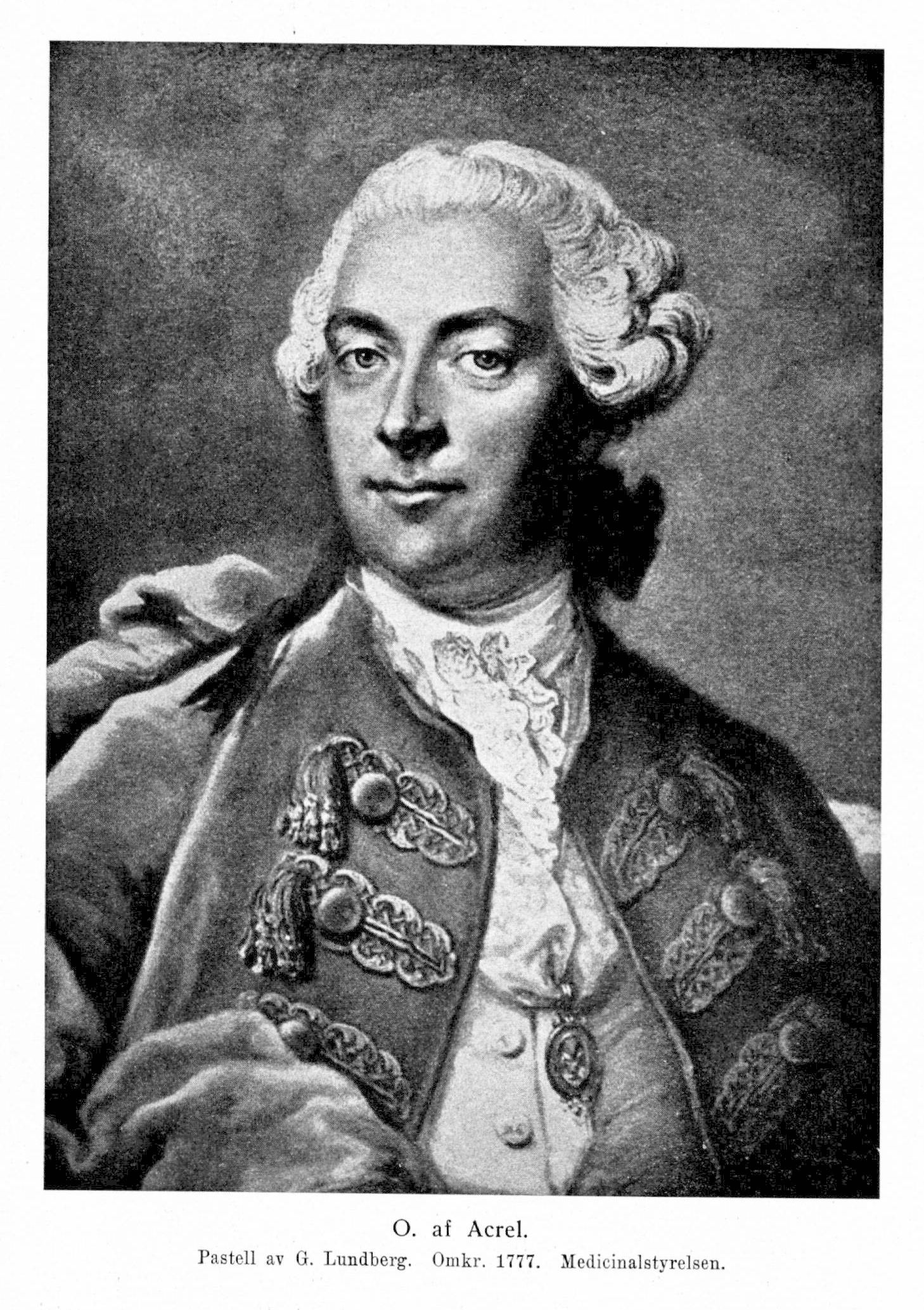 1. Olof af Acrel, f. 26 nov. 1717 i Österåker, Uppsala stift, d 28 maj 1806 i Stockholm. Föräldrar: kyrkoherden i Österåker Johan Acrelius och Sara Gahm. Lärling hos fältskärsmästaren i Stockholm Gerhard Boltenhagen 1735; biträde hos överdirektören i kirurgiska societeten, stadskirurgen i Stockholm Salomon Schutzer 1738; anträdde 1740 en utrikes studieresa, som räckte nära fem år, till Danmark, Tyskland, Schweiz, Italien, Frankrike och England. Inskrevs efter, avlagd examen i kirurgiska societetens matrikel 12 okt. 1744; regementsfältskär vid adelsfanan 28 febr. 1751; kirurg utan lön vid det 30 okt. 1752 öppnade serafimerlasarettet, vilken befattning han ensam innehade till 1772, då K. F. Schulzenheim blev hans medhjälpare; erhöll professors titel 1 sept. 1755; direktör för frimurarbarnhuset s. å.; med. doktor 16 juni 1760; ledamot av sundhetskommissionen 24 sept. s. å.; generaldirektör över samtliga lasarett i riket 13 maj 1776; adlad 1 nov. 1780; erhöll avsked 25 febr. 1800. LVA 1746 (preses 1750, 1767, 1793); RVO 1776; RNO 1795; KVO 1799 samt ledamot av ett flertal utländska lärda sällskap. En medalj över A. präglades 1781 av vetenskapsakademin.