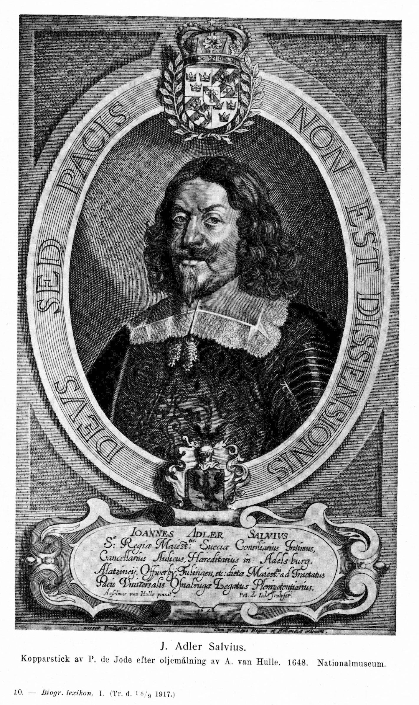 Adler Salvius, Johan, före adlandet Salvius, f. 1590, d 24 aug. 1652. Föräldrar: stadsskrivaren i Strängnäs Peder Hansson, av ångermanländsk allmogesläkt, och hans hustru, enligt personalierna Anna Pedersdotter. Genomgick läroverket i Strängnäs; student i Uppsala 28 mars 1609; medföljde 1612 Magnus von Wernstedt, en son till landshövdingen Kristoffer von Wernstedt, på en utrikes resa, varunder S. och hans lärjunge åtnjöto underhåll av kronärt (K. brev 19 maj 1612); studerade vältalighet för Johannes Simonius i Rostock 1612—13; begav sig till Helmstedt 1613; fil. magister där 7 juli 1614; studerade i Strassburg sommaren 1615; inskrevs vid Marburgs universitet 14 nov. 1615 och idkade där medicinska studier för Johannes Hartmann och Henricus Petraeus; försvarade 1616 som respondens första delen av Petrseus' avhandling »Nosologia harmonica, dogmatica et hermetica»; besökte Sverige; reste ånyo utrikes som preceptor för sin blivande styvson Johan Hartman; begav sig ensam till Montpellier för att fortsätta de medicinska studierna; överflyttade sommaren 1619 till Valence, där han övergick till juridiska studier under Julius Pacius; disp. där s. å.; jur. utr. doktor 5 dec. s. å. ;Uppfördes efter hemkomsten påförslag till assessor i Svea hovrätt 6 sept. 1620 men fick ej platsen; avfärdad till det nyanlagda Göteborg med vidsträckta uppdrag 23 maj 1621; assessor i Svea hovrätt 27 juni 1621; avsänd i diplomatiska uppdrag, till Kursachsen 1622 (instruktion 9 apr.; avlade rapport i rådet 15 juni), till Danmark 1623 (instruktioner 15 juni, 12 aug.) samt till Nordtyskland 1624 (instruktion 8 jan.); erhöll avsked ur hovrätten 27 juli 1624; statssekreterare s. å.; ånyo avfärdad till Tyskland 1625 (instruktion 8 febr.); åtföljde konungen till Lifland s. å. samt till Preussen 1626, 1627 och 1628 (diarium 29 apr.—30 okt., tryckt, i Loenbom, Hist. archivum III st.); tillika häradshövding i Sunnerbo härad 27 apr. 1627 samt, obekant när, i Marks härad; adlad 26 jan. 1629; avfärdad till Kristian IV och, jämte kommissarier av högre rang, till fredskongressen i Lybeck s. å. (instruktioner 26 jan. och 23 febr.); en av de kommissarier, som underhandlade med franska sändebudet Charnacé 1629—30; medföljde konungen till Tyskland 1630; avfärdad till Kristian IV och ett flertal tyska furstar och städer i nordvästra Tyskland (instruktion 30 juni); begav sig till huvudarmén aug. 1631; ordinarie resident i Hamburg 17 sept. 1631; återvände till Sverige sommaren 1634; hovkansler och sekret råd 28 juni s. å.; avfärdad till hertigen av Holstein-Gottorp för att underhandla om den föreslagna persiska handeln, till ett flertal tyska furstar och städer samt till Axel Oxenstierna 1635 (memorial 30 apr.; kreditiv 15 maj; relation i rådet 15 och 17 aug.); ånyo avfärdad till Tyskland 1636, där han residerade i Hamburg (instruktion 28 apr. och memorial av Oxenstierna 22 och 29 juni 1636 samt nya föreskrifter 23 mars och 14 sept. 1637); jämte Johan Oxenstierna Sveriges ombud vid westfaliska fredskongressen 1641 (instruktion 5 okt.); riksråd 27 mars 1648 (bibehöll tillika hovkanslersämbetet till 1651); återkom från Tyskland 1650; friherre 12 mars 1651; kommissarie till fredstraktaten med Polen i Lybeck 1651 (fullmakt 28 maj 1651, instruktioner s. d. och 30 juli 1652); erhöll jämväl i uppdrag att underhandla om förbund med Frankrike 1651 (instruktion och fullmakt 10 juli).