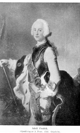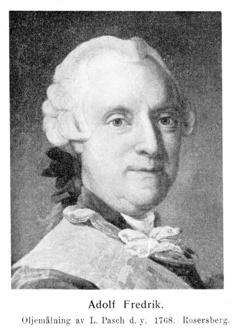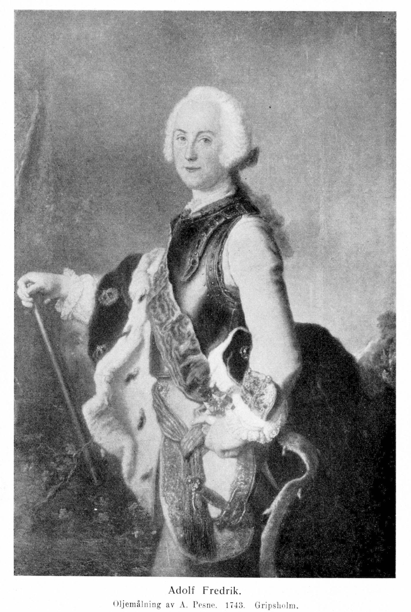 Adolf Fredrik (Adolph Friedrich), f. 14 maj (n. st.) 1710, d 12 febr. 1771. Föräldrar: furstbiskopen av Lybeck Kristian August, yngre broder till hertig Fredrik IV av Holstein-Gottorp och administratör av hertigdömena under brorsonen hertig Karl Fredriks minderårighet, d 1726, och hans maka Albertine Friedrike av Baden-Durlach, dottersons dotter av konung Karl IX, d 1755. Furstbiskop av Lybeck 16 sept. (n. st.) 1727; administratör av hertigdömena Holstein-Gottorp och förmyndare för hertig Karl Peter Ulrik 18 juni (n. st.) 1739; svensk tronföljare 23 juni 1743; generalissimus över Sveriges krigsmakt till lands och sjöss 16 febr. 1747; Uppsala universitets kansler 26 febr. s. å.; Sveriges konung 25 mars 1751; krönt 26 nov. s. å.