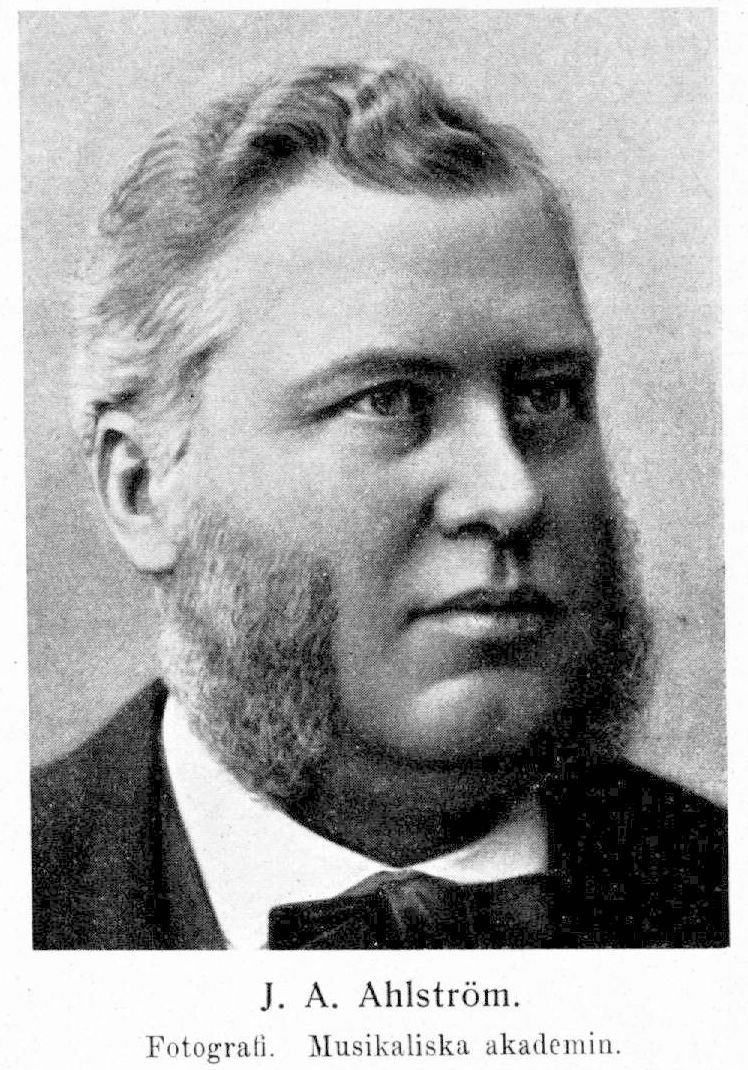 Ahlström, Johan Alfred, f. 1 jan. 1833 i Stockholm, d 26 mars 1910. Föräldrar: sadelmakaregesallen Johan Ahlström och Kristina Ulrika Dittling. Lär redan vid elva års ålder ha spelat orgel vid skolans morgongudstjänster; skötte vid tretton års ålder orgelverket i änkehusets kyrka i Stockholm, avlade folkskollärarexamen 1848 och organistexamen 1849. Tf, organist i Tyska kyrkan i Stockholm 24 maj–18 juli s. å.; klockspelare därstädes 4 aug. 1849–31 dec. 1878; tf. kantor därstädes 31 maj 1851 för sex månader, räknat från 1 maj; elev vid musikaliska akademins läroverk; avlade därstädes organistexamen med högsta betyg 1853 samt scholse cantus examen; studerade under år 1867 komposition i samma läroverks artistklass för Frans Berwald (icke såsom uppgivits för Johan Fredrik Berwald); organist i katolska kyrkan i Stockholm 1875–1 juni 1890. Associerad i musikaliska akademin 1857. — Ogift.