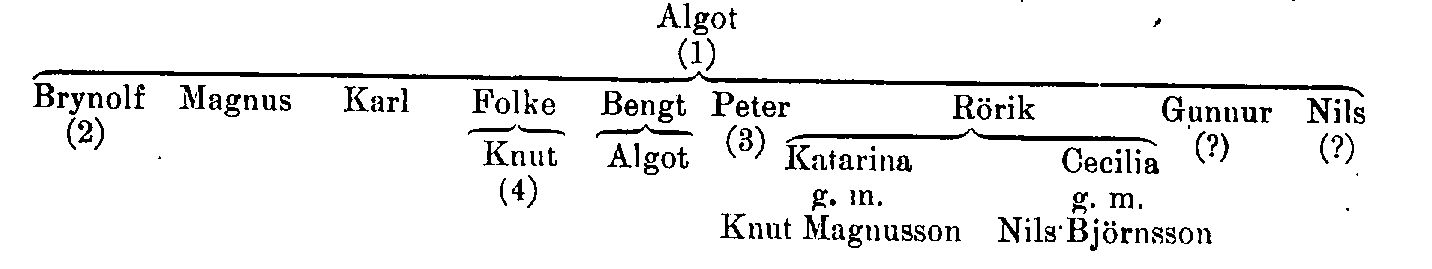 Följande barn till lagman Algot (III) äro kända: Brynolf (se nedan 2), Magnus, d 1309, fängslad för någon förseelse mot norrmannen Ragvald Mule och frigiven på drottning Sofias förbön vid hennes bröllop, sedan jämväl fadern och Brynolf erlagt skadestånd, Karl, d 1289, Folke, Bengt, Peter kansler (se nedan 3) och Rörik; ovisst är, om Gunnur Algotsdotter och kaniken Nils Algotsson voro barn av Algot. Folke hade med Ingrid Svantepolksdotter sonen Knut (se nedan 4), Bengt blev far till Algot, lagman i Västergötland och medlem av den kommitté, som utarbetade Magnus Erikssons landslag; Knut och Algot förde båda i vapnet ett griphuvud. Rörik hade döttrarna Katarina, gift med Västgötalagmannen Knut Magnusson, vilken till största delen hade sina gods i Södermanland och deltog i Södermannalagens utarbetande, samt Cecilia, gift med Nils Björnsson, lagman i Närke; de återfingo av hertiginnan Ingeborg och konung Magnus en del av sin faders efter brudrovskatastrofen (se nedan) konfiskerade gods.