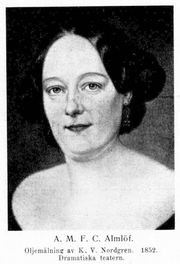 2. Anna Maria Francisca Charlotta Almlöf, f. Ficker, den föregåendes hustru i hans andra gifte, f. 16 juni 1813 i Stockholm, d 11 nov. 1881 därstädes. Föräldrar: oboisten i hovkapellet Kristian Fredrik Ficker och Johanna Charlotta Widerberg. Elev vid K. teatern 1 juli 1830; debuterade 23 sept. 1831 såsom Zelinda i »Califen i Bagdad»; aktris 1834–56.