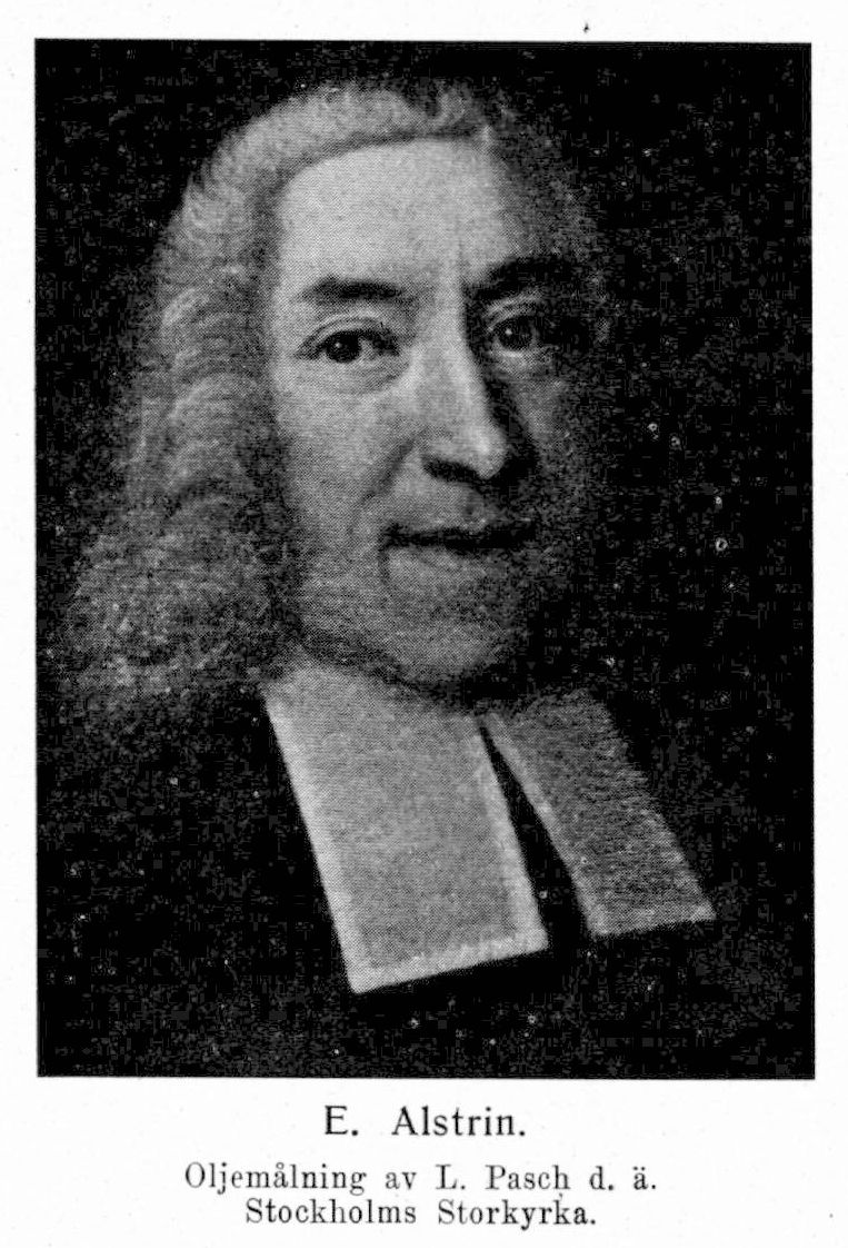 Alstrin, Eric, f. 3 febr. 1683, d 4 nov. 1762. Föräldrar: kyrkoherden i Leksand Lars Alstrin och Kristina Ångerman. Inskriven som student vid Uppsala universitet 16 febr. 1691; företog en utrikes resa 1706–13; fil. magister 1708 i Greifswald. Vikarie för v. bibliotekarien vid universitetsbiblioteket i Uppsala J. Malmström 1716; akademisekreterare 22 juli 1719; logices och metaphysices professor (professor i teoretisk filosofi) 17 maj 1723; prästvigd 16 maj 1727; kyrkoherde i Leksand 16 febr. 1731; pastor primarius i Stockholm 28 dec. 1734; uppfördes på förslag till superintendent i Karlstad 12 aug. 1741; biskop i Växjö 12 juli 1742 samt i Strängnäs 17 okt. 1748; uppfördes på förslag till biskop i Västerås 16 apr. 1751 och till ärkebiskop 1758 (rådsprot. 7 nov.). Teol. doktor 23 febr. 1732.
