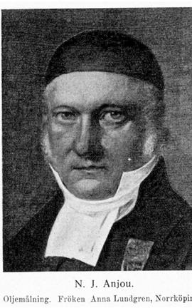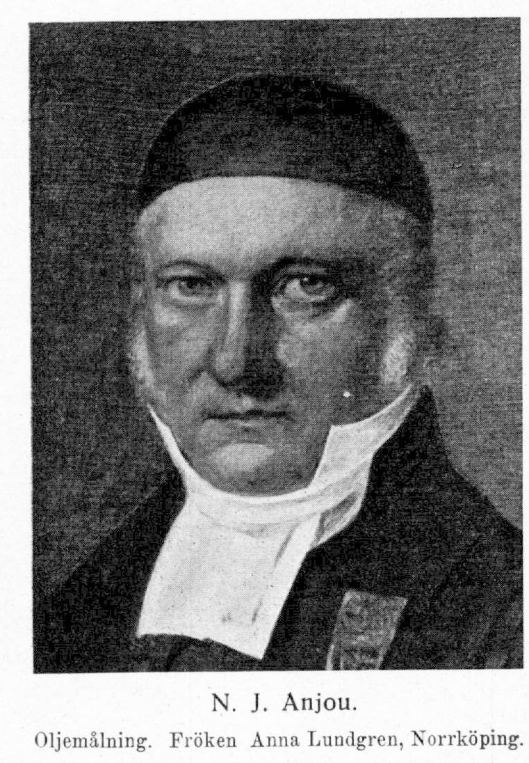 1. Nils Jakob Anjou, f. 19 maj 1781 i Skederid, d 24 mars 1851 i Norrköping. Föräldrar: kyrkoherden i Husby-Lyhundra och Skederid Filip Jakob Anjou och Charlotta Margareta Humble. Student i Uppsala 13 juni 1794; disp. 6 dec. 1800 (Ad enchiridion juris prudentise ecclesiasticse Svecanas, pres. N. A. Pihlman) och 18 maj 1803 (Specimen supplementorum ad lexica Hebraica, p. V, pres. J. A. Tingstadius); fil. magister 16 juni 1803; studerade i Köpenhamn och Rostock 1804; teol. kand. i Uppsala 5 dec. 1805; prästvigd 10 dec. 1808; avlade pastoralexamen 11 dec. 1816. Docent, i teologi 15 mars 1807; domkyrkosyssloman 24 okt. 1812; kyrkoherde i Husby-Lyhundra och Skederid 28 jan. 1818 (tillträdde 1 maj 1820); kontraktsprost 5 sept. 1821; kyrkoherde i Roslagsbro 6 febr. 1822 (tillträdde 1 maj 1824); utan ansökan uppförd på förslag till Klara församling i Stockholm 4 nov. 1823; revisor i bankodiskonten 1825; ledamot i revisionen över stats-, banko- och riksgäldsverken 15 sept.–15 dec. s. å.; ledamot av riksdagens prästestånd 1828–30; kyrkoherde i S: t Olai och S: t Johannes församlingar i Norrköping 21 nov. 1829 (tillträdde 1831); ledamot av kommittéerna angående tullen på spannmål 31 okt. 1829–jan. 1830 samt angående fattigvården i riket utom Stockholm 26 okt. 1838–8 juni 1839; ånyo ledamot av riksdagens prästestånd 1844–45. LNO 1830; teol. doktor 14 juni 1831; ledamot av det nordiske oldskrifts-selskab 1838.