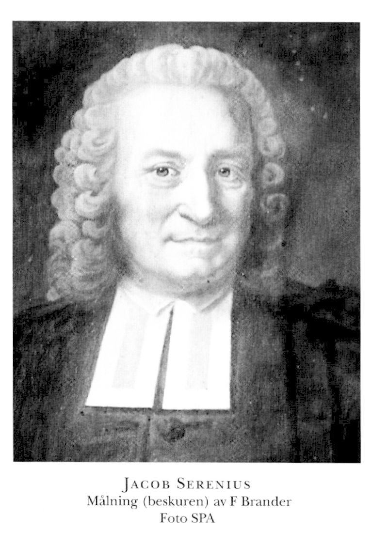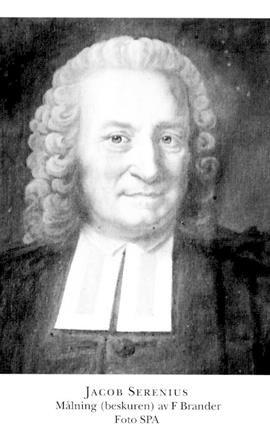 Serenius, Jacob, f 25 juli 1700 i Färentuna, Sth, d 4 sept 1776 i Strängnäs. Föräldrar: kyrkoherden Sven S o Christina Livonia. Inskr vid UU 30 jan 09, disp vt 20 o vt 22, mag där 12 juni 22, prästv 9 juni 22, v pastor i Färentuna o Hilleshög, Sth, 22–23, kh i sv förs i London 22 juli 23–35, e o predikant vid K drabanterna april 28, notarie i hovkonsistorium 4 nov 28 (tilltr ej), kh i Kungsbacka 14 april 30 (tilltr ej), pastoralex i Uppsala 26 nov 34, kh i Allhelgona o Nyköpings östra förs 6 mars 35, kontraktsprost 9 april 36, led av prästeståndet vid riksdagarna 38–52 o 60–72 (led av bl a SU 38/39–42/43, av mindre sekreta deput 42/43), utn TD i samband med Adolf Fredriks kröning 26 nov 51, prom TD vid UU 15 juni 52, biskop i Strängnäs stift från 21 mars 63, led av bibelkommissionen 18 maj 73.