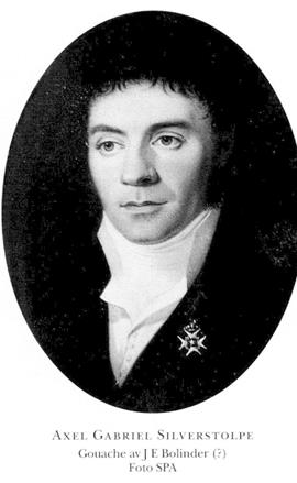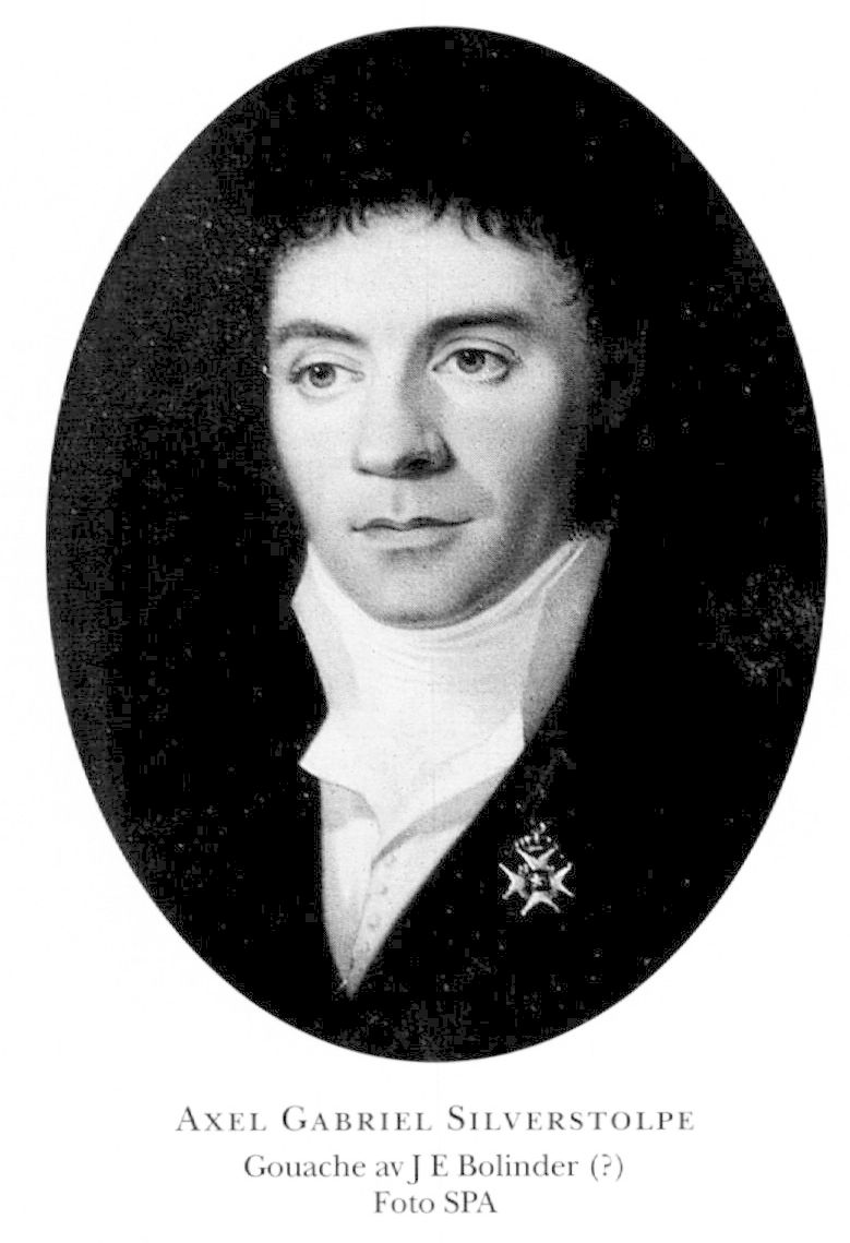 1 Silverstolpe, Axel Gabriel, f 10 aug 1762 i Sthlm, Klara, d 5 sept 1816 där, Nik. Föräldrar: bankokommissarien Fredrik S o frih Katarina Eleonora LeijonhufVud. Inskr vid UU 1 maj 69, extra riddarhuskanslist 78, andre riddarhuskanslist 10 febr 79, kansliex vid UU 12 dec 80, e o kanslist i krigsexpeditionen 19 jan 81, kopist där 4 sept 82–9 juni 89, förste kanslist i Riddarhuskansliet 18 maj 82-95, deltog i riksdagarna 86–15 urt (led av KU 09/10–15 urt, av heml utsk 10 urt), auskultant i Svea hovrätt 11 april 89–95, hovjunkare o hand-sekr hos änkedrottning Sofia Magdalena 11 maj 92–7 mars 95 o åter 12 dec 96, kammarherre o handsekr hos änkedrottningen maj 11–13, riddarhussekr 28 febr 95–16, led av tryckfrihetskomm från 10, av uppfostringskomm från jan 12, skald. – LMA 93, LSA 94, LVA 98, LSkS 15.