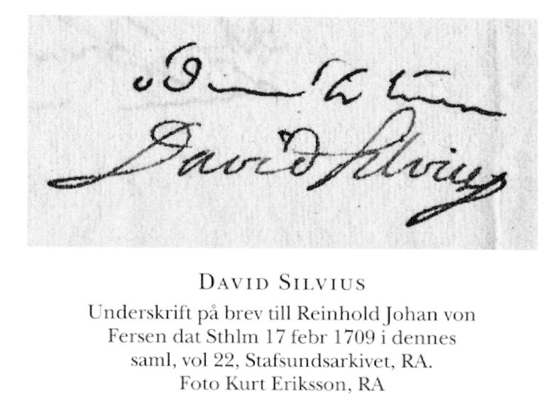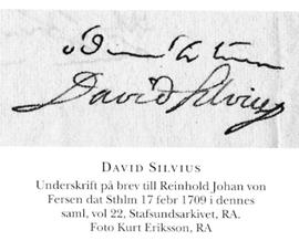 Silvius, David, f 10 dec 1663 (v Schantz' geneal:er, RHA), d 6 okt 1732 (v Schantz; bet för ringn 10 okt i Sthlm, Klara). Föräldrar: lagmannen o translator regius Johan Sylvius och Ingeborg Hinman. Inskr vid UU 8 nov 77, auskultant i Svea hovrätt 5 febr 90, notarie i Kammarrevisionen 12 sept 94, sekr i Kommerskoll 23 febr 10, deltog i riksdagarna 19–26/27 (led av deput ang riddarhusordn 20–23, SU 23, ecklesiastikdeput 23–26/27, urskiljn:deput 26/27, ekon- o kommersedeput 26/27), kommerseråds titel 20 juni 19, ord kommerseråd 17 dec 20, led av rannsakmkommissionen ang de religiösa sammankomsterna i Sickla okt 23-26, av 1724 års statskommission okt 23, av kommissionen för överseende av politi- o brandordn:en maj 24. Polit förf.