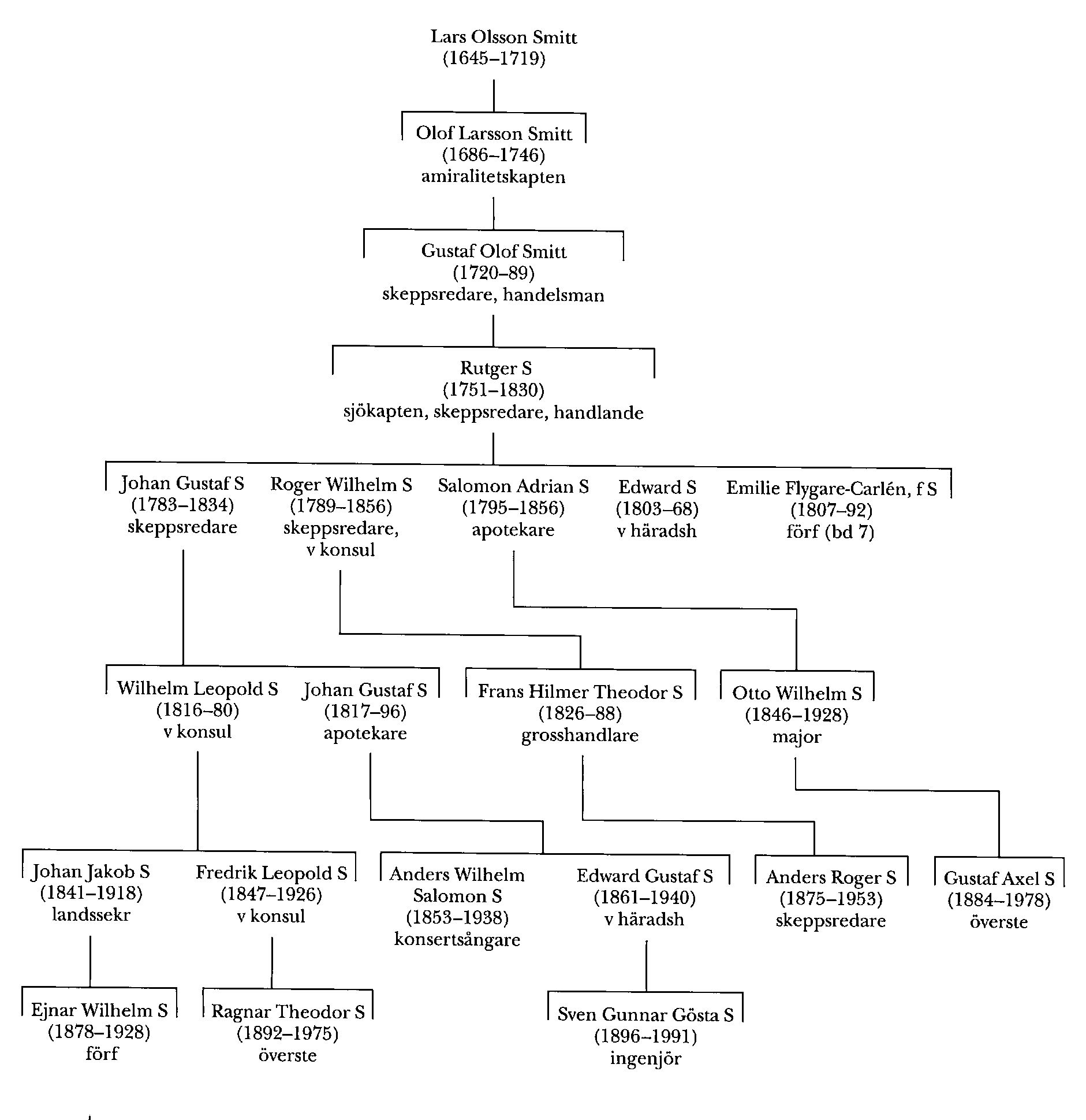 Källor o litt: Allmänt: http://www.slf-smith-frs.se (släktfören S från Strömstad, 2003.11.26); G A Smith, Emilie Flygare-Carlén: hennes liv o verk (1958); SMoK; Sv släktkal 1913 (1912) o 1963 (1963); Väd; Väv.