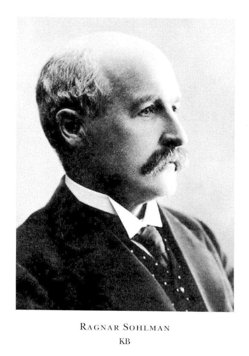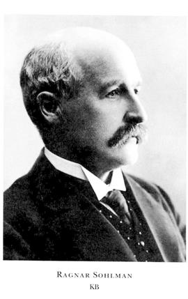 2 Sohlman, Ragnar, son till S 1, f 26 febr 1870 i Sthlm, Hovförs, d 9 juli 1948 där, Kungsh. Mogenhetsex vid Sthlms reallärov 18 maj 87, inskr vid KTH 14 sept 87, avgångsex från avd för kemi o kemisk teknologi där 10 juni 90, kemist vid Fahnehjelm Incandescant Gas Light Co o vid Mutual Fuel Gas Light Co, Chicago, 90–92, vid Hercules Powder Co, Cleveland, 93, assistent hos A Nobel (bd 27) i Paris, San Remo o Bofors 93–96, testamentsexekutör i A Nobels dödsbo 97-00, disponent o VD för ab Bofors Nobelkrut 98–19, led av styr där 98–29, led av styr för Nobelstiftelsen 00–46, verkst led 29–36, VD där 36–46, led av skolrådet i Karlskoga 03–20, av komm ang explosiva varor okt 08–febr 10, v VD i ab Bofors-Gullspång 08–19, led av styr där 08–28, led av styr för Karlskoga kommunala mellanskola 10–18, kommerseråd o chef för Kommmerskoll:s industribyrå 12 dec 19–29 febr (k beslut 31 jan) 36, ordf i komm ang produktionen av tidn:papper juli 20–jan 21, led av styr för Statens provmanst 20–38, av komm ang industriell demokrati i flera länder jan–dec 24, av UD:s antagn:kommission 31 dec 29–40, av delegationen för traktatförhandbar med Storbritannien 32–33, v ordf i Exportkreditnämnden 33–38, sakk hos Nationernas Förbunds oljekomm 36, ordf i Jernkontorets fullm 36–42, v ordf i styr för ab Gbgs bank 36–43, ordf i 1936 års hantverkssakk jan 36–aug 39, i styr för Statens hantverksinst 37–40. – LIVA 20, HedLIVA 35, Iqml 40.