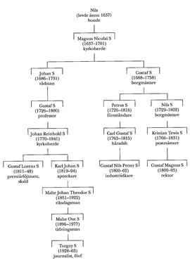 Son till Gustaf S var Johan Reinhold S (1770–1841), som efter studier vid LU blev biblioteksamanuens 1791, magister 1793 och bibliotekarie där 1794. Det var faderns tanke att sonen skulle efterträda honom, men S kunde inte leva upp till dennes krav. Istället prästvigdes han 1801 och avlade pastoralexamen 1804 för att 1810 bli kyrkoherde i Mörrum, Blek. Mot slutet av sitt liv drabbades han av sinnessjukdom och tycks sedan ha blivit alltmer excentrisk och i flera avseenden olämplig som präst.