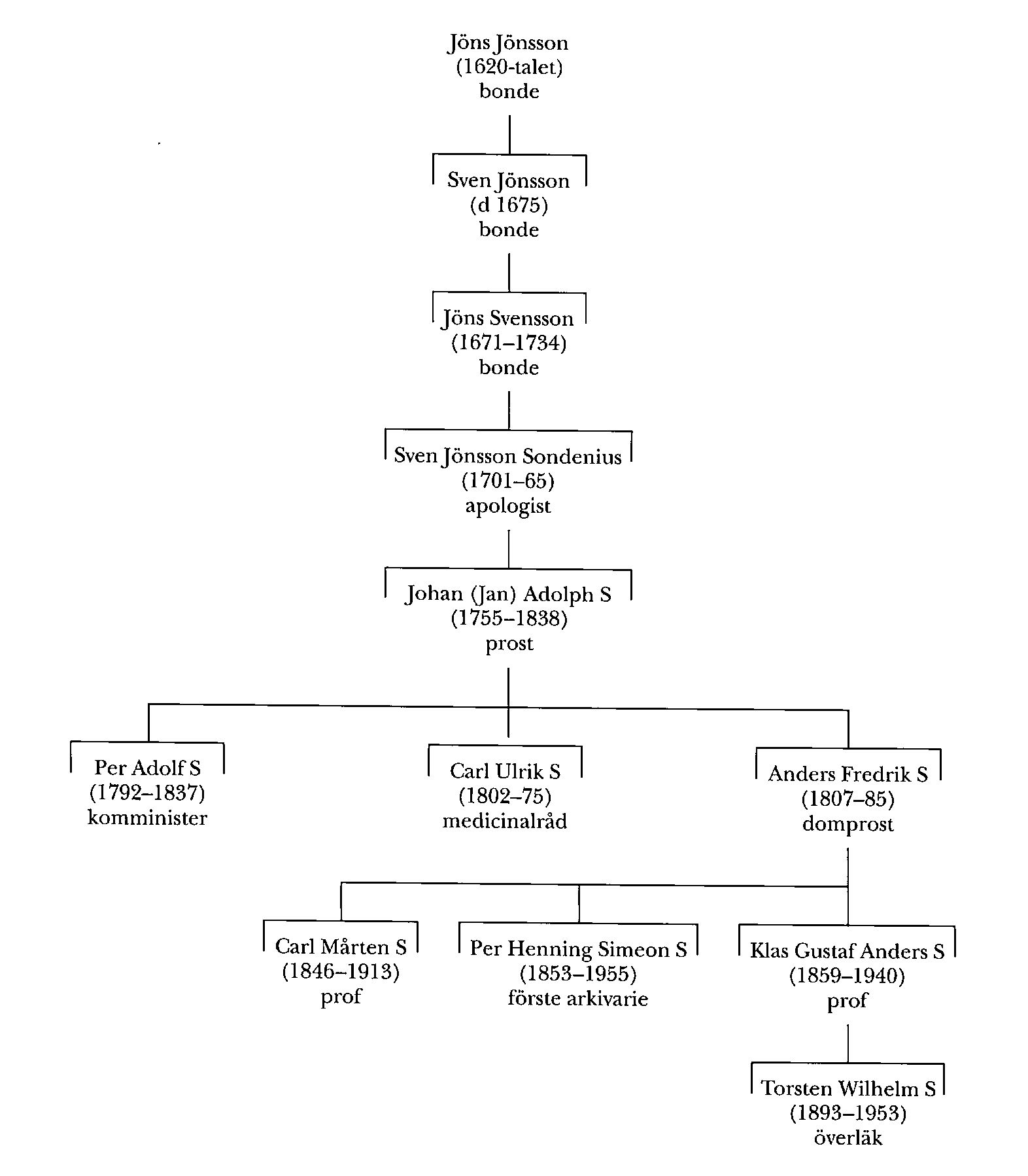 Bröder till S var läkaren Carl Ulrik S (nedan) och Anders Fredrik S (1807–85). Den senare genomgick Linköpings gymnasium och inskrevs 1824 vid UU, där han avlade fil kand-examen 1833 och promoverades till magister s å. Han verkade därefter som lektor i matematik vid Linköpings gymnasium 1835–57 och var rektor där i två omgångar (1840–41 och 1844–47). Fredrik S prästvigdes 1837, var 1846–56 kyrkoherde i Skeda prebendepastorat och 1857–65 kyrkoherde i Kvillinge och Simonstorps församlingar, Ög. Han blev prost 1857 och var 1865–85 domprost i Skara. Vid LU:s jubelfest 1868 utnämndes han till teol hedersdoktor. S var ledamot av prästeståndet vid alla riksdagar 1853–66 varvid han bl a tillhörde bevillnings- och statsutskotten. Han var också ledamot av kyrkomötena 1868, 1873 och 1878 liksom av 1847 års läroverkskommitté och 1872 års kommitté för inrättande av Prästerskapets änke- och pupillkassa.