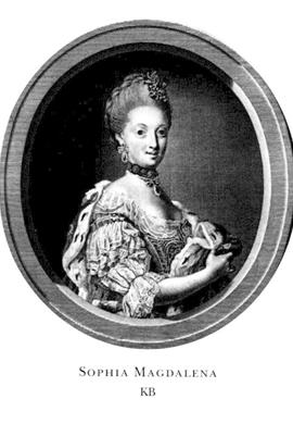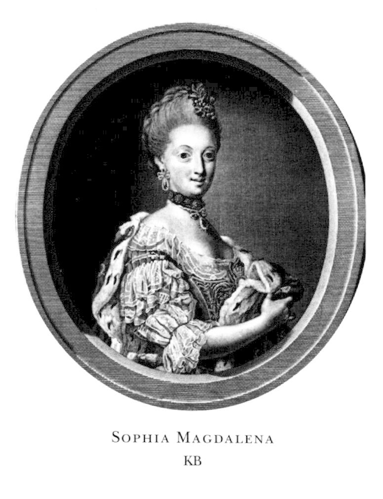 Sophia Magdalena (Sophie Magdalene), f 3 juli 1746 på Charlottenborgs slott, Khvn, d 21 aug 1813 på Ulriksdals slott, Solna, Sth. Föräldrar: konung Fredrik V av Danmark o Louise av England. Sveriges kronprinsessa 1 okt 66, Sveriges drottning 12 febr 71, krönt i Storkyrkan i Sthlm 29 maj 72.