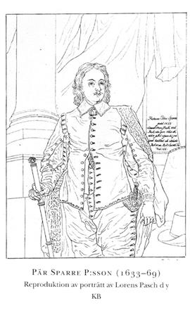 S:s son Pär S P:sson (1633–69) inskrevs vid UU 1643 och vid universitetet i Leiden 1649 samt företog 1652–56 vidsträckta resor i Europa. Enligt RR sändes han våren 1655 på beskickning till Nederländerna, men breven från den sv beskickningen där detta år är undertecknade av hans kusin Gustaf S, vilket torde vittna om att förnamnet blivit felskrivet i RR. 1656 blev S kammarherre hos drottning Hedvig Eleonora, som han följde, då hon besökte sin make Karl X Gustav i Preussen. 1658 blev han vicepresident i Svea hovrätt, och såväl vid den senare av de båda riksdagarna 1660 som vid riksdagen 1664 var han lantmarskalk. Litteraturuppgiften (bl a Elgenstierna o Asker, a a 2004), att S var guvernör i Livland 1660–64, beror på förväxling med kusinen Per S Larsson (S 2), såsom framgår av deras namnteckningar och av att guvernören vid sin utnämning kallas överste. Pär S P:sson sändes 1661 till Wien för underhandlingar om kejserlig investitur för Sveriges tyska besittningar, men de svenska kraven avslogs 1662. 1664 blev han riksråd. S uppges (Fegraeus) ha till svenska översatt böcker av den romerske historieskrivaren Curtius.