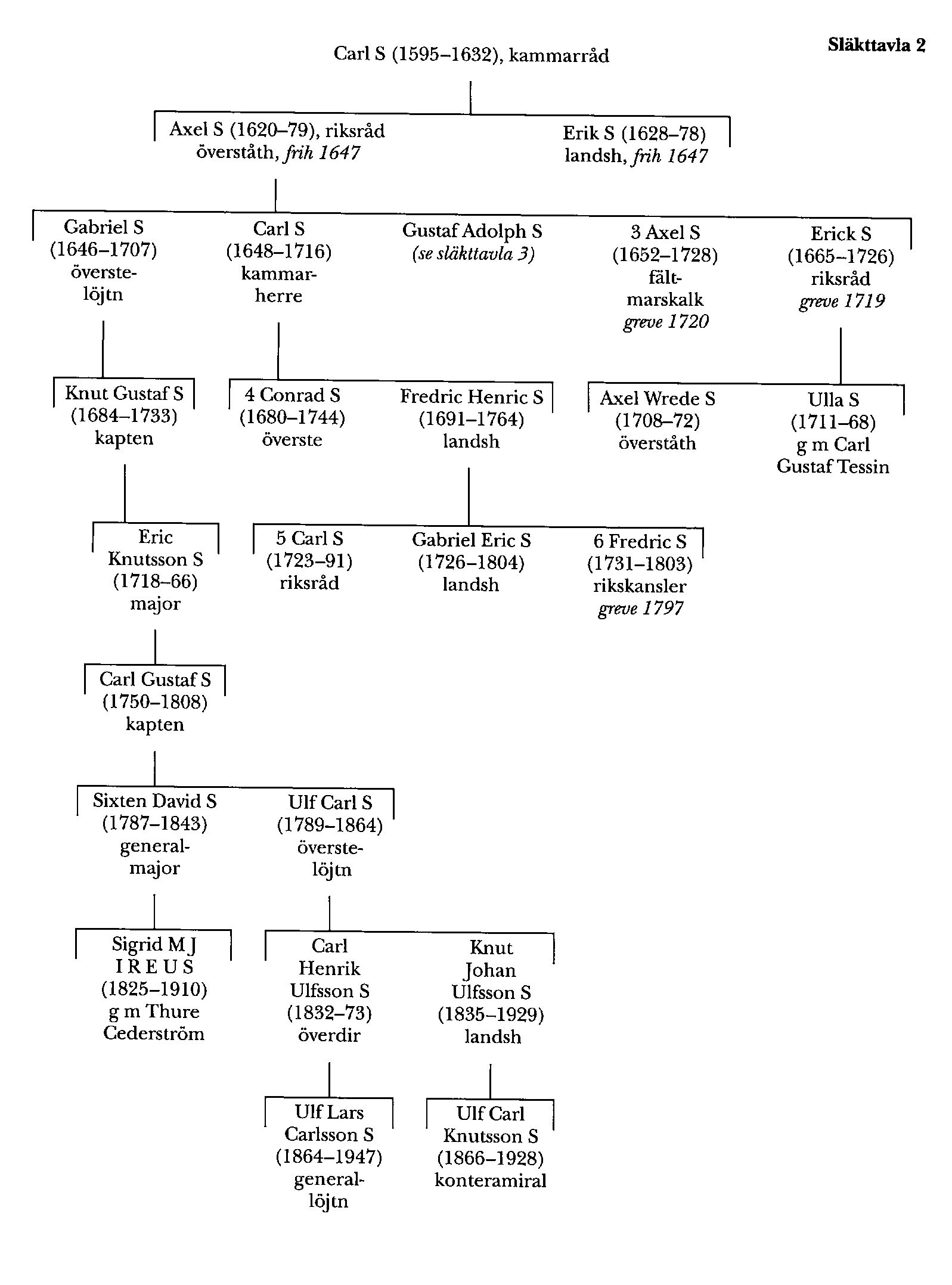 Axel Wrede S:s kusin Conrad S:s (S 4) halvbror Fredric Henric S (1691–1764), vars mor Anna Ebba var dotter till fältmarskalken Henrik Horn, deltog från 1707 i fransk tjänst i Spanska tronföljdskriget. 1710 gick han i sv tjänst och blev engagerad i försvaret av Pommern. Senare deltog S i kriget i Finland 1741–42 och var en av de tre officerare som representerade Sverige vid kapitulationen i Hfors. Han blev 1747 överste för Livgardet och 1748 för Upplands regemente, befordrades 1750 till generalmajor av infanteriet och var en av de sex på förslagsrum vid riksrådsval 1751 uppförda som avsade sig sina förslagsrum. 1756 (ej 1760) blev S generallöjtnant, och 1757–62 var han den siste landshövdingen i det odelade Västernorrlands län. Vid länsdelningen 1762 kvarstod han som landshövding i det nybildade Gävleborgs län (Gästrikland, Hälsingland och Härjedalen), men 1763 blev han genom byte med sin son Carl S (S 5) i stället landshövding i Österbottens län, varpå han tog avsked. S var far till Carl Reinhold v Fersens (bd 15) gemål Charlotta (Lotta) Fredrika S (1719–95), som var bland dem som 1744 förde sedermera drottning Lovisa Ulrika till Sverige, blev hovfröken hos henne 1748, hovmästarinna 1760 och var från 1780 drottning Sophia Magdalenas överhovmästarinna. Andra barn till honom var riksrådet Carl Fredrik Törnflychts gemål Brita Christina S och Fredric S (S 6). Den sistnämnde, som var det enda av barnen som var fött i hans äktenskap med kanslipresidenten Carl Gustaf Tessins syster Ulrica Maria, blev greve 1797, men denna grevliga släktgren dog ut på manssidan redan 1812.