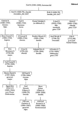 Johan S:s bror Erik S (S 1) hade tolv barn, av vilka tio nådde vuxen ålder. Av dem blev Gustaf S (f 1582; levde ännu 1627) överste och kammarherre hos kung Sigismund och gift med astronomen Tycho Brahes dotter Sidsel.