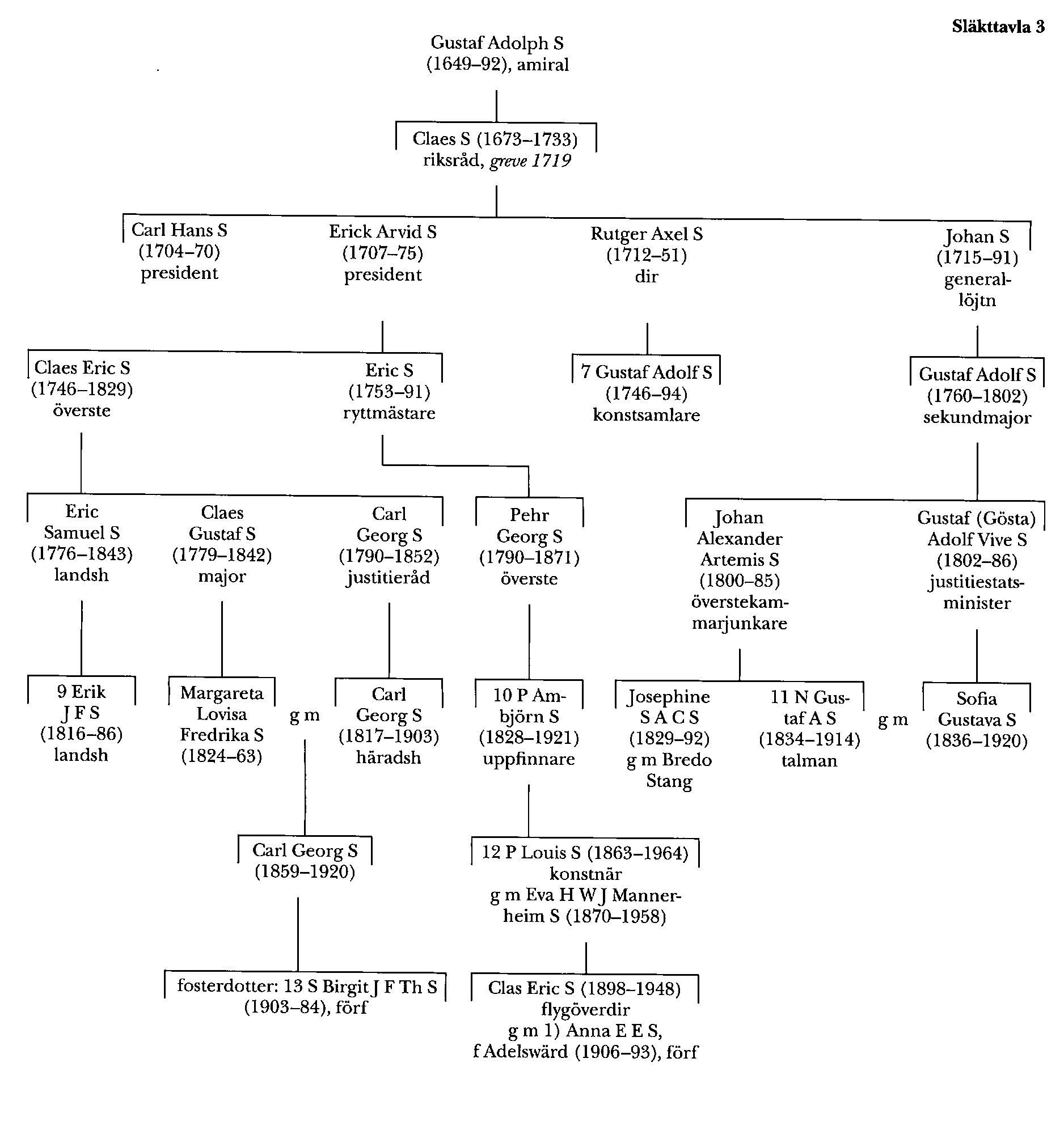 S:s son Pehr Ambjörn S (S 10) blev far till Pehr Louis S (S 12), vilken i äktenskap med den finländske marskalken och presidenten Gustaf Mannerheims syster författarinnan och bokkonstnärinnan Eva Hedvig Wilhelmina Johanna Mannerheim S (bd 25, s 80) blev far till Clas Eric S (1898–1948). Clas S befordrades till flygdirektör av andra graden 1937, var 1937–43 överingenjör och direktörsassistent vid Sv aeroplan ab (SAAB) med tjänstgöring som chef för dess verkstäder i Trollhättan men återvände därefter till Flygvapnet som innehavare av en nyinrättad befattning som flygöverdirektör.