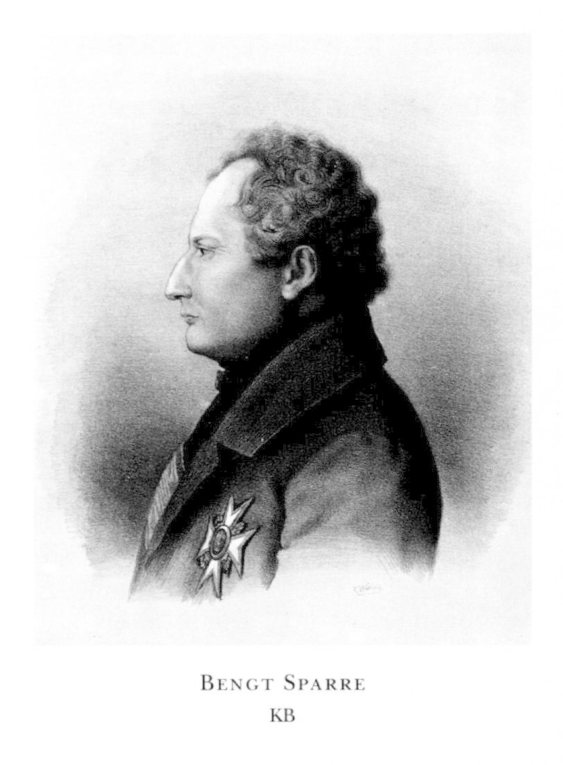 8 Sparre (från 1814 Franc-Sparre), Bengt Erland, ättling till en av S 1:s halvbröder, f 15 mars 1774 i Vassunda, Sth, d 20 aug 1837 i Flöda, Söd. Föräldrar: kaptenen Gabriel S o Maria Wendela Ulfsparre. Fänrik vid Södermanlands reg 14 dec 85, konduktör vid Fortifikationen 26 april 93, löjtn i armén 28 febr 96, stabsadjutant hos konungen o kapten i armén 7 april 96, kapten vid Björneborgs reg 3 juni 99, överadjutant hos konungen o major i armén 9 sept 01, brigadadjutant o major vid Nyländska brigaden 18 dec 01, adjutant hos generalbefälhavaren G M Armfelt (bd 2) i Pommern 04, hos ambassadören C v Stedingk vid ryska armén i Mähren 05, generaladjutant av flygeln o överstelöjtn i armén 1 mars 05, överstelöjtn vid pommerska fortifikationen 9 juni 06, överstelöjtn vid Fortifikationen 3 dec 07, överadjutant för expeditionen vid Västra armén mars 08–sept 09, överste i armén 25 dec 08, chef för fästn:arna i Skåne 10–11, sekundchef för Ingenjörkåren 28 sept 11, chef där från 30 juni 12, generalmajor 10 sept 13, erhöll K M:ts tillstånd att kalla sig Franc-Sparre 24 maj 14, frih löjan 15 (introd 33), deltog i riksdagarna 15-34/35 urt (led av statsutsk 17/18, av särsk utsk 23, av bankoutsk 28/30–34/35), led av 1819 års befästn:komm febr–maj 19, av komm ang en förbättrad fångvård nov 20–mars 23, ordf i dir för Arméns pensionskassa 11 nov 24, led av komm ang nytt brandreglemente för Sthlms stad dec 25–april 27, av komm ang förordn om sysslolösa personer dec 25–sept 28, av komm ang rikets allm undervisn:verk dec 25–dec 28, av komm ang inrättandet av Teknologiska inst mars–maj 26, generallöjtn 11 maj 26, led av dir för Teknologiska inst från 20 april 27, av komm ang omorganisation av Krigskoll sept 28-juli 29, tf inspektor vid Pionjärkåren 30, ordf i styr för Göta kanal-bolag 23 jan 30-23 mars 33, led av komm ang fördeln av anslag till försvarsverket febr-sept 30, tf president i Krigskoll från 17 nov 32, led av komm ang ackorderna inom värvade armén mars–april 33, greve 16 nov 33 (ej introd), v ordf i Sv missionssällsk 35, ordf i Sv nykterhetssällsk 37. – Led av Sv krigsmannasällsk (från 04 KrVA) 98, HedLKrVA 18 (förste sekr april 98–00, styresman från 36), LVA 36.