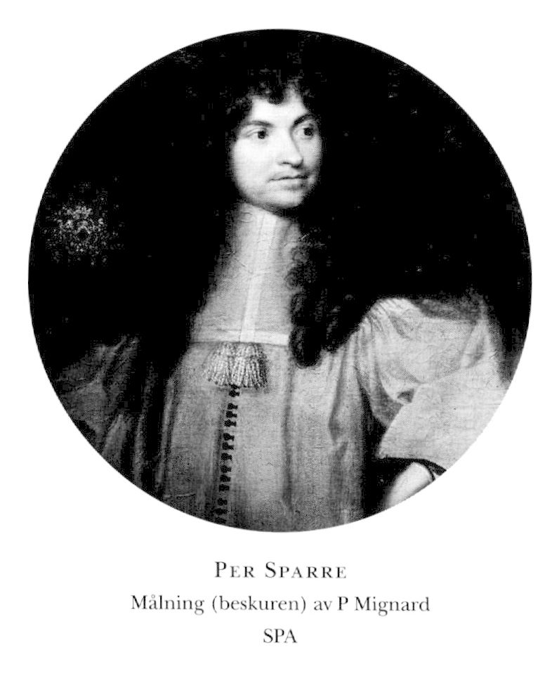 2 Sparre Larsson, Per, sonson till S 1, f 28 juni 1628 (inskr på kista o huvudbanér, se Sveriges kyrkor, Sthlm, 2, 1937, s 572), d 4 april 1692 i Sthlm (Karl XI:s almanacksant:ar, utg av S Hildebrand, 1918, s 229; bet för själaringn s d i Sthlm, Nik). Föräldrar: riksrådet Lars S (s 703) o Märta Baner. Inskr vid UU 3 april 36, frih 6 mars 47 (introd 49), kammarherre hos drottn Kristina, deltog i riksdagarna 54, 60 (Gbg), 64–68 o 78–89 (led av bl a SU 60 (Gbg), 64–68 o 80–89 samt av riddarhusdir 80–82), kapten vid Livg juli 54, överstelöjtn vid Drottn:ens livreg till fot mars 55, överste o chef för Ångermanlands reg hösten 56, för Kronobergs reg 59, guvernör i Riga 18 mars 60, generalmajor av infanteriet 20 juni 60, kommissarie vid förhandl:arna med Ryssland i Plüsemunde 4 febr 63, guvernör över Älvsborgs län 16 dec 63–74, generallöjtn 2 okt 64, general 26 aug 68, e o legat till England 31 juli 72 (instruktion), till fredskongressen i Köln 2 febr 74, rikstygmästare 23 nov 74, ambassadör extraordinaire till England, Frankrike o Nederländerna 3 april 75, fransk greve 8 maj 75, generalfälttygmästare från 26 april 82.