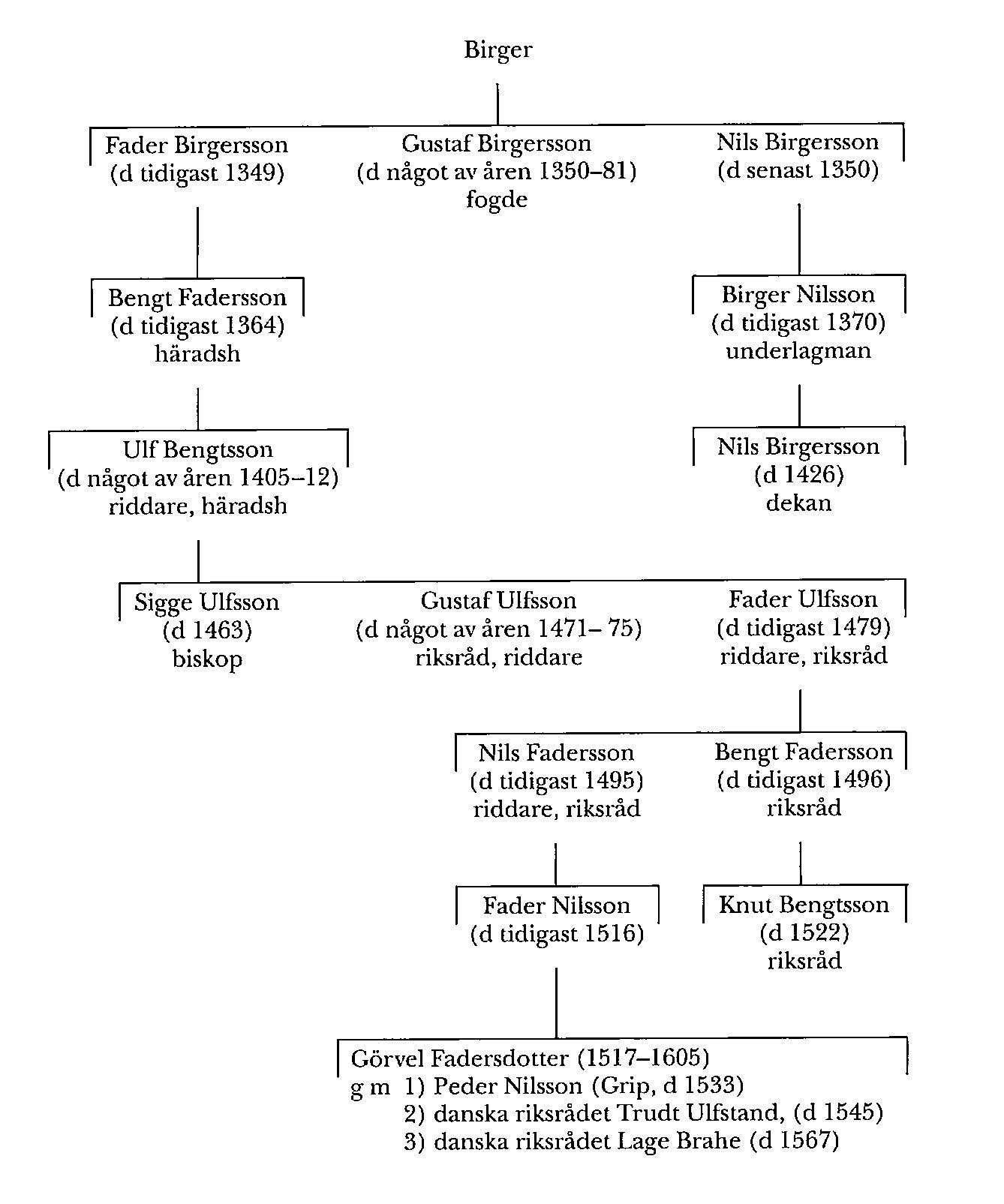 Brodern Gustaf Birgersson (d något av åren 1350–81), blev något av åren 1330–33 fogde i Sthlm men hade redan 1334 fått en efterträdare där. Han och hans familj begravdes i Forssa kyrka i Södermanland. En av hans och Fader Birgerssons systrar blev sannolikt mor till ärkebiskopen Birger Gregersson (Malstaätten; bd 4). Deras bror Nils Birgersson (d senast 1350) blev far till underlagmannen i Södermanland Birger Nilsson (d tidigast 1370), som var far till dekanen Nils Birgersson (d 1426) i Strängnäs.