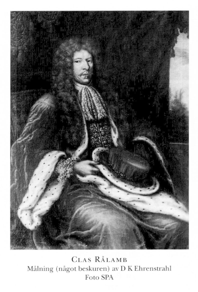 1 Rålamb, Clas, f 8 maj 1622 i Sthlm (RS, vol 41 o 170), d 14 mars 1698 (anf källor; bet för själaringn bl a 16 mars 1698 i Sthlm, Nik). Föräldrar: landshövdingen Broor Andersson o Anna Tott. Inskr vid UU 22 juni 38, företog utrikes resor 42–44, inskr vid univ i Leiden 42, deltog i riksdagarna 44–78, krigs- o hovråd (på pommerska staten) 30 juni 55–60, envoyé extraordinaire till Höga porten 22 febr 57 (instr 23 sept 56)–maj 58, landsh i Uppsala län 2 juni 60–jan 65, kurator vid UU 14 febr 63, riksråd 27 aug 64–82, rikskammarråd 12 sept 64–27 dec 73, led av kommissionen över statsverket febr–juni 68, av skånska kommissionen aug 69-70, av kommissionen över Sthlms stads förvaltn mars 72–73, överståth 18 juni 73–78, frih 25 mars 74 (introd 75), led av deput för undersökn av kammarförvaltn sedan år 1675 nov–dec 78, president i Göta hovrätt 12 dec 78-82, lagman i Norra Finlands lagsaga 24 juni 80-82, led av pommerska huvudkommissionen juli 80-81.