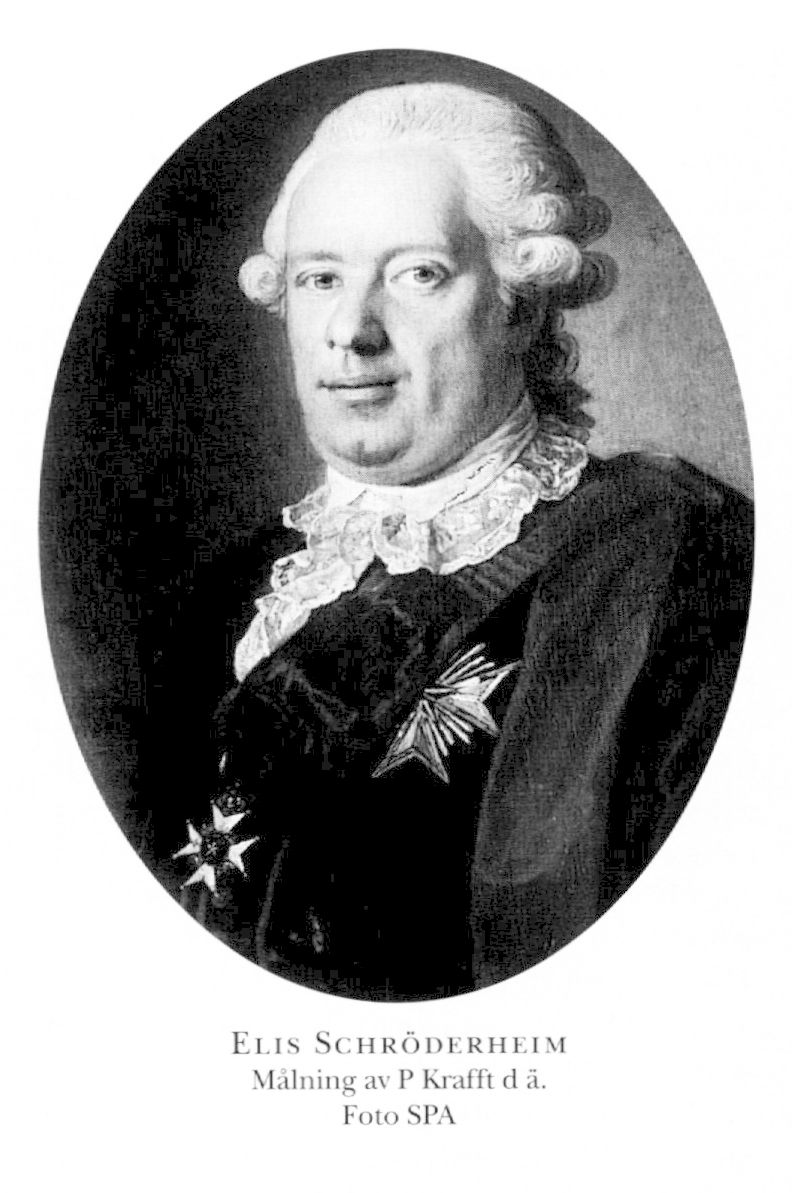 2 Schröderheim, Elis (före adl Schröder), sonson till S 1, f 26, dp 28 mars 1747 i Sthlm, Hovf, d 30 aug 1795 i Solna (ej i db). Föräldrar: biskopen Georg (Jöran) Claes Schröder o Margareta Elisabeth Elis. Adl tills med sina syskon för faderns förtjänster 10 okt 59, inskr vid UU 28 aug 60, eo kanslist i kammarexp 64, kopist 26 april 68, kanslist där 20 april 73, prot:sekr vid K kansliet 12 aug 73, ordenshärold 28 april 74, förste exp:sekr vid inrikes civilexp 25 okt 75, sekr i bondeståndet vid riksdagarna 78 o 86, rikshärold 28 april 80–28 april 86, statssekr i inrikes civilexp 19 april 82, led av Generaltulldir 85–91, v landsh i Uppsala län 5 okt 86 o 2 febr 87, led av rikets ärenders allm beredn 89–92, sekr i SU vid riksdagarna 89 o 92, ordf i Nummerlotteridir 91–92, tf hovkansler 4 jan 92, landsh i Uppsala län 8 aug 92–29 april 94. – LPS 81, LSA 86, LVA 86, HedLVHAA 91, HedLVS 93.