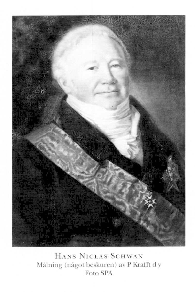 1 Schwan, Hans Niclas, f 12 juni 1764 i Kalmar, d 1 maj 1829 i Sthlm, Nik. Föräldrar: handlanden o rådmannen Johan S o Helena Catharina Botin. Elev i Kalmar trivialskola 74, inskr vid UU 1 okt 79, kontorsbetjänt hos firma Schön & co, Sthlm, 2 okt 81, deläg 90, erhöll burskap som grosshandlare i Sthlm 19 aug 94, led av Konvojkommissariatet 7 mars 99, av Sthlms stads borgerskaps 50 äldste 00, ordf där 10–27, fullm i Generaltullarrendesoc 02, led av styr för Ostindiska kompaniet 17 juni 06–13, av borgarståndet vid riksdagarna 09–10 o 12–23 (talman 09–10,12–15 o 23, led av statsutsk 17–18), led av Riksbankens fullm 15 febr 10-28, av komm ang Karlshamns handlandes nederlagsfrihet febr-nov 12, av Generaltulldir:s fullm 13, av komm ang ny förordn mot lurendrejeri o tullförsnilln dec 12–mars 17, av Sthlm stads drätselkommission 14–27, av komm ang handelstraktat med Nordamerikanska fristaterna maj 15–april 16, av 1822 års finanskomm maj 22–febr 23, av komm ang Sveriges o Norges ömsesidiga handels- o sjöfartsförhållanden april 24–april 25, av komm ang nytt brandreglemente för Sthlm dec 25–april 27, av komm ang sjukvårdens förbättrande i Sthlm febr–okt 27, statsråd från 6 febr 28. – LVA 28.