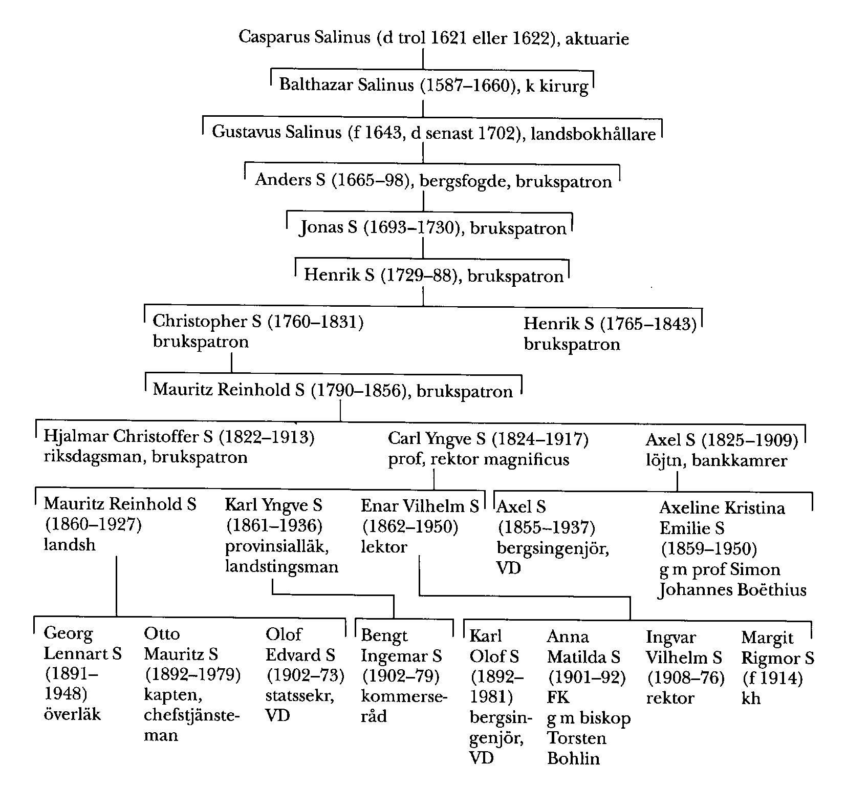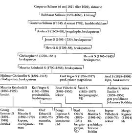 En av S:s söner, Gustavus Salinus (f 1643, d senast 1702), var 1662–73 skrivare och bokhållare i Kammarkollegiet och utnämndes sistnämnda år till landsbokhållare (landskamrer) i Örebro (Närke-Värmlands) län. 1676 fick han avsked på grund av sjuklighet. Hans son Anders S (1665-98) blev bergsfogde i Värmland 1689 men begärde efter konflikter med bergmästaren själv avsked sex år senare. Genom sitt gifte med Agneta Bratt (1669–1742), dotter till brukspatronen Anders Andersson Bratt (bd 6, s 83), blev han medintressent i Brattfors hyttor, Brattfors, Värml, som han slutligen tillsammans med hustrun blev ägare av.