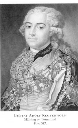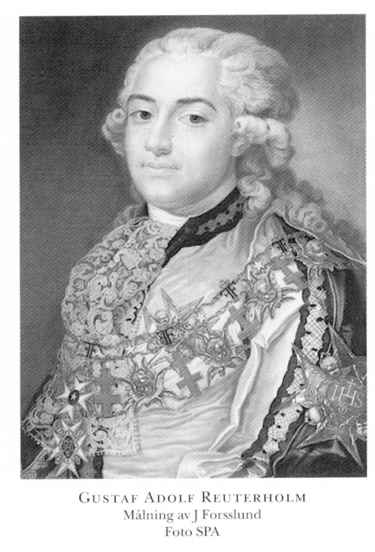 4 Reuterholm, Gustaf Adolf, son till R 2, f 7 juli 1756 i Sjundeå, Nylands län, d 27 dec 1813 i Schleswig-Friedrichsberg, Tyskland. Inskr vid UU 14 febr 69, volontär vid Västmanlands reg 16 sept 70, sergeant där 15 juni 71, vid Östgöta infanterireg 22 mars 73, fänrik i armén 30 nov 74, placerad till tjänstgöring vid Västmanlands reg 22 maj 75, avsked ur krigstjänsten 1 sept 77, hovjunkare hos Gustav III 15 sept 77, kammarherre hos drottn Sofia Magdalena 27 dec 78, deltog i riksdagarna 86 o 89, led av Generaltulldir 87–93, överkammarherre hos änkedrottn 3 juli 92, president i Kammarrevisionen o led av hertigen-regenten Karls konselj 7 juli 92, tf rikskansler 6 juni 96, entledigad från sina ämbeten 22 okt 96, vistades utomlands 96–97 o från 00. – En av rikets herrar 17 maj 93, Serafimerriddare 24 nov 94, hedersled av K målar- o bildhuggarakad 95, LVA 96. – Ogift.