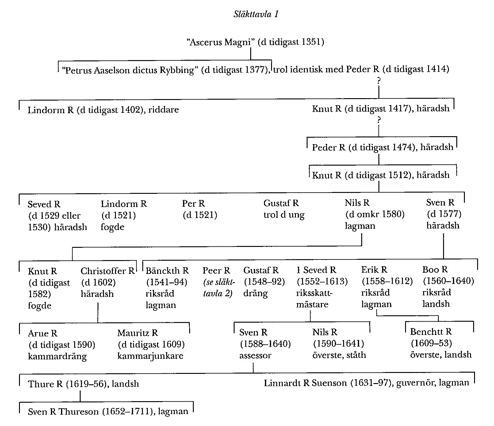 Sigvid Bengtssons och Knut Sigvidssons förutnämnda anknytning till Marks härad i Västergötland kan tyda på nära släktskap med den förste kände häradshövdingen där, Knut R (d tidigast 1417), vilken nämns som sådan 1415. Han hade 1402 beseglat ett salubrev tillsammans med Peder R (d tidigast 1414) och en riddare Lindorm R som ej nämns i livet senare. Det har påståtts (DAA; Hildebrand), att de var bröder, men härför saknas bevis. Eftersom Peder R i brevet 1402 nämns före Lindorm R, ehuru denne hade riddartitel, förefaller det snarare som om Peder var far till Lindorm och Knut (Liljeholm), särskilt som de senare ej kunnat beläggas förrän på 1390-talet, medan Peder R kan vara identisk med den eller de personer med detta namn som förekommer redan 1355 och 1364. Han är troligen också identisk med den person som i kung Olofs endast i avskrifter kända handfästning 1377 kallas Petrus Aaselson – eller Axelsson – dictus Rybbing, vilket kombinerats (DAA; Elgenstierna; Mohlin) med att en Ascerus Magni (d tidigast 1351) förde släkten R:s vapen och hade en bror med namnet Sigvid; på 1390-talet beseglade Peder och Knut R åt Peter Prikas änka Ingeborg Sigvidsdotter (d tidigast 1413), som också förde släkten R:s vapen och därför förmodats (Liedgren) ha varit dotter till Sigvid Magnusson.