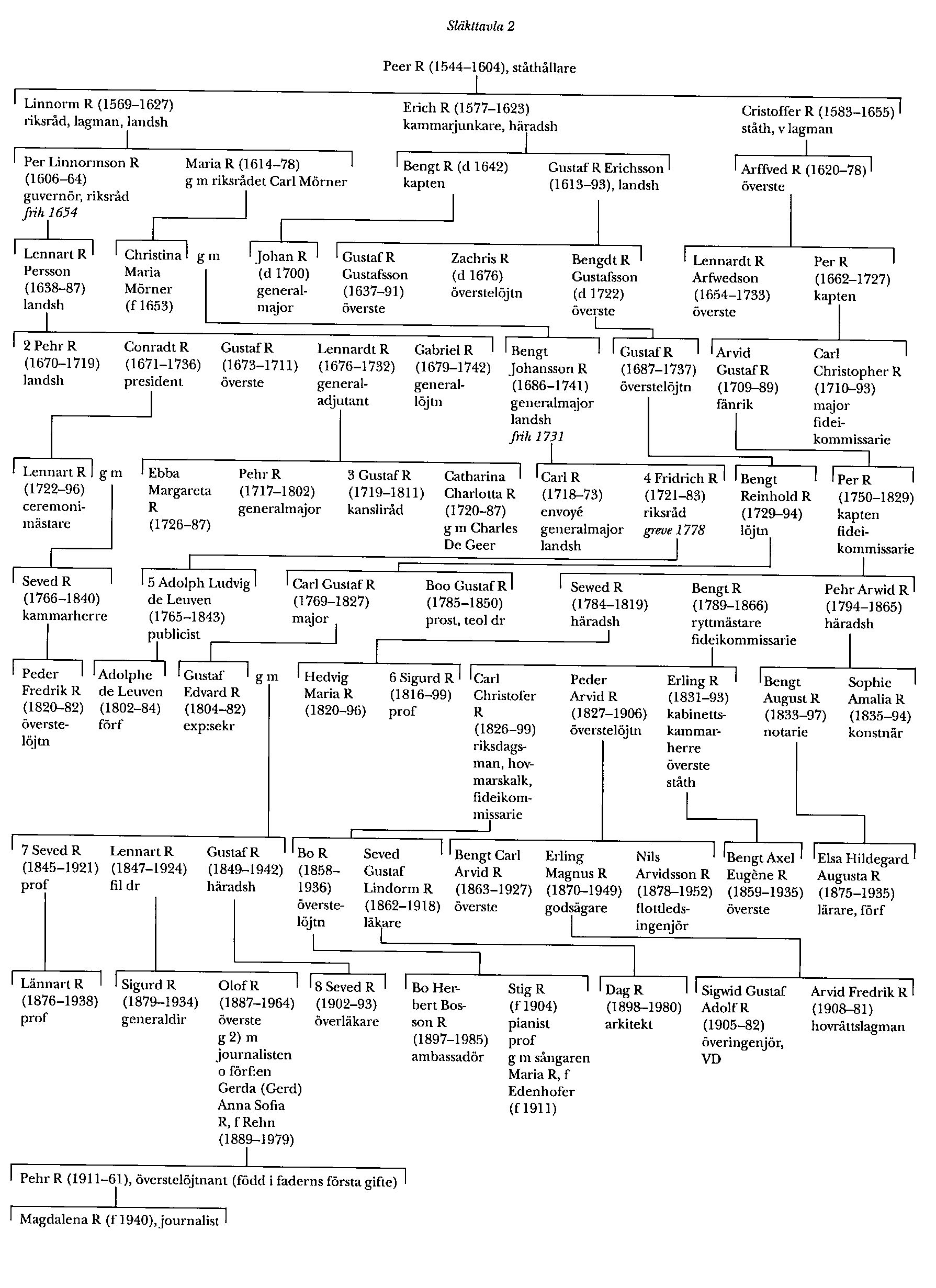 Släktens ännu fortlevande grenar härstammar från R 1:s samt Bänckth, Gustaf, Erik och Boo R:s bror Peer R (1544–1604) på Ulvsnäs i Öggestorp i Småland. Han nämns bland kungens småsvenner 1562–65 och bland dennes kammartjänare 1566 och var en av dem åt vilka bevakningen av den fängslade Erik XIV anförtroddes på Gripsholm 1572–73 och på Örbyhus 1575. 1577 fick R fullmakt att vikariera i slottsloven på Vadstena, där han tidigare varit verksam åtminstone 1566-68 och senare kan beläggas 1578, 1579 och 1581, befullmäktigades att vara i slottsloven 1589 och var ståthållare 1603. Dessemellan förordnades han i slottsloven på Kalmar 1591. Han var också häradshövding, framför allt från 1578 till sin död i Tveta härad i Småland. 1600 var R liksom sina bröder R 1 och Erik bland bisittarna i domstolen i Linköping över de tillfångatagna rådsherrarna, och från 1602 till sin död var han lagman i Tiohärad, där han efterträddes av brodern Erik. R:s anteckningar om familjedata finns i Ericsbergsarkivets autografsamling i RA.