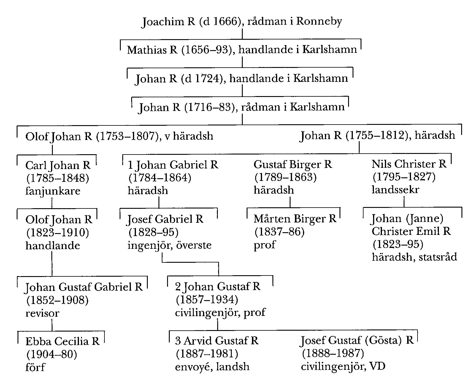 Söner till R 2 var envoyén och landshövdingen Arvid Gustaf R (R 3) och Josef Gustaf (Gösta) R (1888–1987). Den senare utexaminerades 1913 från KTH:s väg- och vattenbyggnadslinje och knöts 1915 till det av hans far grundade tekniska konsultföretaget ab Vattenbyggnadsbyrån (VBB). Han kvarstod där under hela sitt yrkesverksamma liv, med avbrott för ett uppdrag som arbetschef vid flodregleringar och hamnarbeten i Kina 1919–21, och var direktörsassistent i företaget 1921–40, VD 1940–54 och styrelseordförande 1954–66. Han blev också företagets störste aktieägare. Gösta R:s roll i VBB var i första hand av administrativ natur, medan hans insatser som tekniker i egna projekt blev begränsade. Han deltog livligt i företagets internationalisering, under mellankrigstiden tidvis med placering i London, och under hans tid som VD fortsatte dess utveckling som ledande i branschen med över 150 ingenjörer anställda vid andra världskrigets slut. Den tidigare inriktningen på vattenkraft och kommunalteknik hade då kompletterats med stadsplanering, ett område där byrån snabbt gjorde uppmärksammade insatser. R var en humanistiskt sinnad tekniker med intresse för moralfrågor och han utövade ett stort inflytande på utformningen av de konsulterande ingenjörernas yrkesetik. Han hade många förtroendeuppdrag i branschen närstående organisationer, bl a som styrelseledamot i Sv konsulterande ingenjörers förening och Sv vattenkraftföreningen.