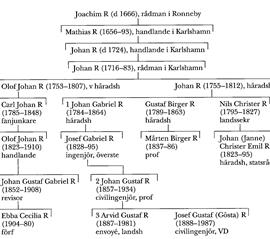 Josef Gustaf (Gösta) R: T Althin, Vattenbyggnadsbyrån 1897–1947 (1947); SvTeknF. – Nekr:er över R i DN 23 okt o 28 okt o i SvD 24 okt o 2 nov 1987. Johan (Janne) Christer Emil R: R Nygren, Subordination o ensk integritet (1981); Oscar II, Mina memoarer, ed N F Holm, 1 (1960); T Petré, Ministären Themptander (1945); J-O Sundell, Tysk påverkan på sv civilrättsdoktrin 1870–1914 (1987).