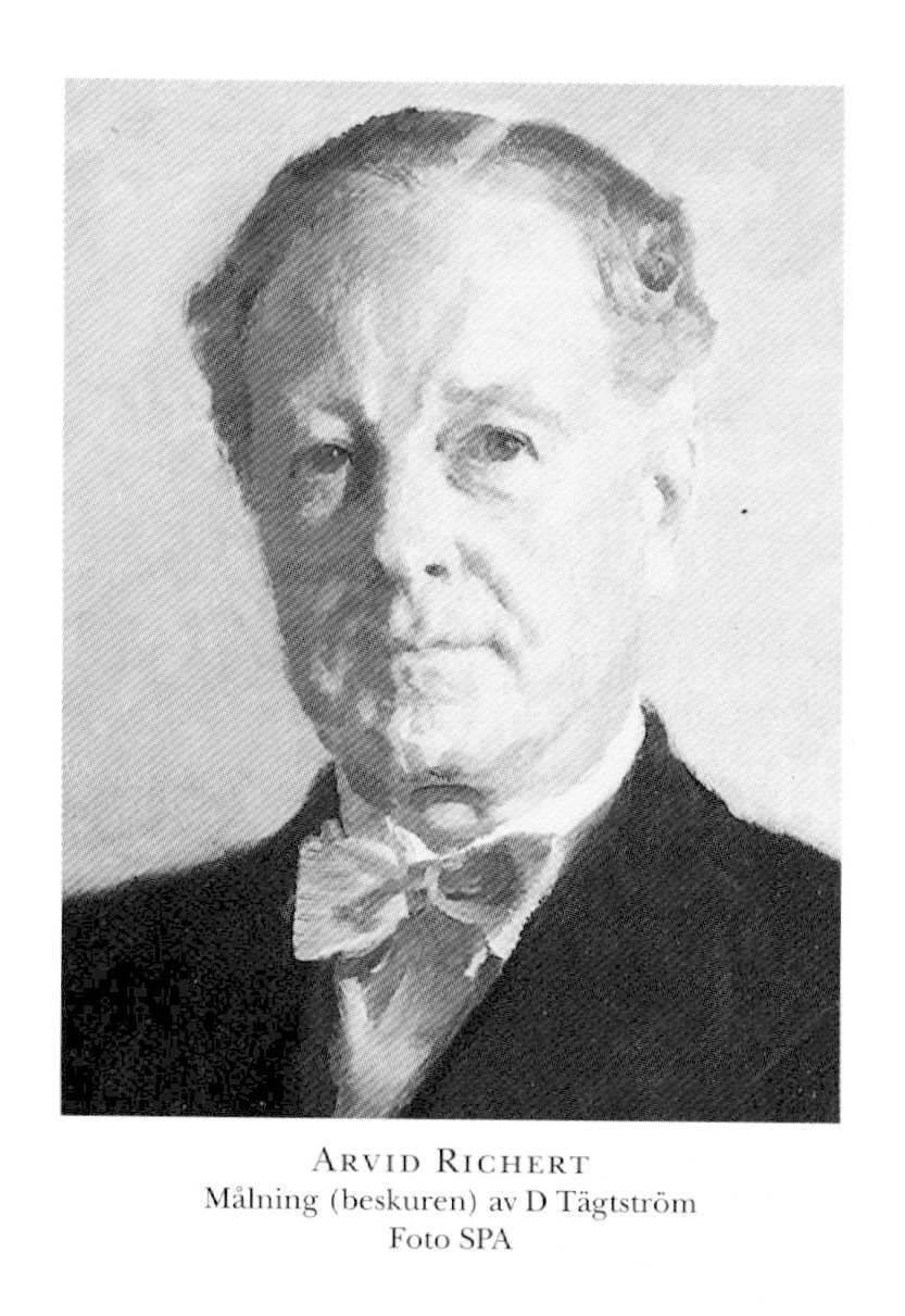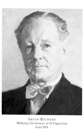 3 Richert, Arvid Gustaf, son till R 2, f 5 april 1887 i Gbg, Domk, d 22 aug 1981 där, ibid. Mogenhetsex vid Beskowska skolan, Sthlm, 26 maj 06, inskr vid UU 3 okt 07, JK där 18 april 14, underlöjtn i Fortifikationens reserv 31 dec 09, löjtn där 1 okt 15–18, tingstjänstgöring 14–16, led av styr för Klosters ab, Långshyttan, Husby, Kopp, 14–18, disponentassistent där jan 17–maj 18, anställd i UD 10 juni 18, förste legationssekr i Hfors 16 dec 21, chef för UD:s handelspol avd:s första byrå 27 nov 25, för personal- o administrativa avd:s personal-o räkenskapsbyrå 29 juni 26, för personal- o administrativa avd 31 dec 28, led av antagn:kommissionen 28–31, utrikesråd 21 febr 30, chef för handelsavd 23 jan 31, allt i UD, led av Traktatberedn:en okt 32–jan 37, av 1932 års handelskommitterade jan 32–jan 37, tf statssekr o exp:chef i Handelsdep 3 jan 34, ord 29 maj 36, envoyé i Berlin 29 jan 37–23 april 45, ordf i styr för ab Vattenbyggn:byrån (VBB) 41–54, tjänstgörande i UD 24 april 45, tf generaldir o chef för Kommerskoll 15 juni (tilltr 1 juli) 45, sändebud i disponibilitet vid UD 24 sept 48, landsh i Älvsborgs län 18 juni (tilltr 1 juli) 49-31 dec 54, ordf i styr för Dalslands kanal ab 50–69, i Statens med förhandl:kommission i Gbg mars 55–mars 58, i Riksfören för svenskhetens bevarande i utlandet 55–59.