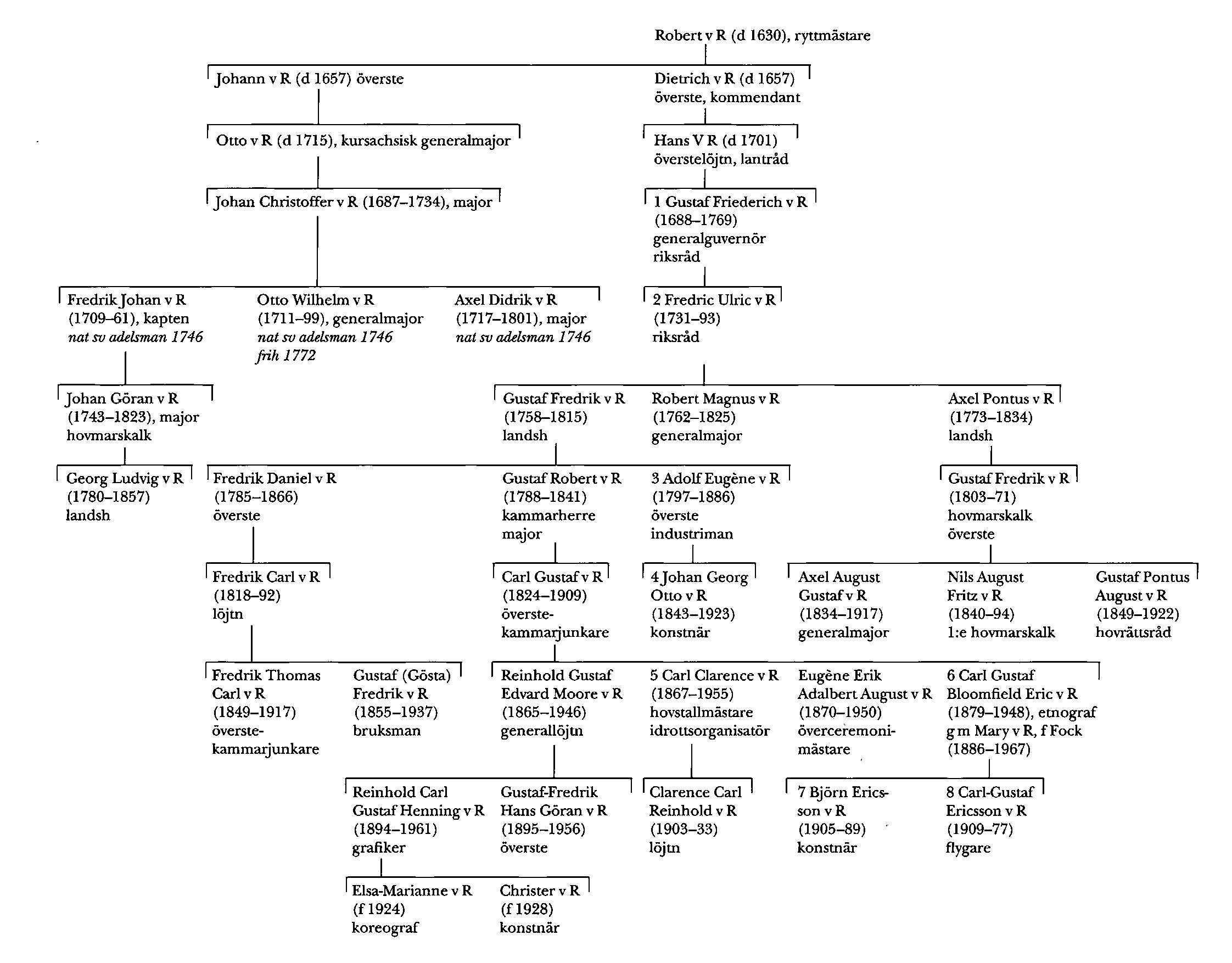 R 3:s äldste bror, översten och chefen för Skånska dragonregementet Fredrik Daniel v R (1785–1866), var far till löjtnanten Fredrik Carl v R (1818–92), som ägde godset Ekhov i Björnlunda, Söd. Fredrik v R var ledamot av Sthlms stadsfullmäktige 1865–73 och 1874–79, VD för Sthlms sjukhem 1867-82 samt ledamot av AK 1876–78. Han var far till Fredrik Thomas Carl v R (1849–1917), som inskrevs vid UU 1870, avlade examen till rättegångsverken 1875, blev auskultant vid Svea hovrätt s å och vice häradshövding 1879. Han gjorde därefter karriär inom utrikestjänsten, var attaché vid beskickningen i Khvn 1878–80, blev andre sekreterare i UD 1880, förste sekreterare 1885 och var 1887–94 kansliråd där och chef för dess kameralavdelning. Fredrik v R var 1887–94 arkivarie vid KM:ts orden.Från 1896 ägnade han sig åt hovtjänst, blev s å kammarherre hos kronprinsen, 1902 överceremonimästare och 1907 överstekammarjunkare.