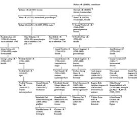 Bror till Johann v R (d 1657) var översten i sv tjänst Dietrich v R (d 1657) till Sonorm, som 1656 blev kommendant i Tykoczin i Polen men följande år sprängde sig jämte fästningen i luften inför de framträngande fienderna. Son till Dietrich v R var Hans v R (d 1701) till bl a Sonorm, som var ryttmästare vid v der Pahlens (sedan Tiesenhausens) livländska kavalleriregemente, där han slutligen blev överstelöjtnant 1700 och deltog i fälttåget 1700-01, tillika estnisk mannrichter och lantråd. Hans v R blev far till generalguvernören och riksrådet Gustaf Friederich v R (R 1), som blev greve 1751 och far till riksrådet Fredric Ulric v R (R 2).