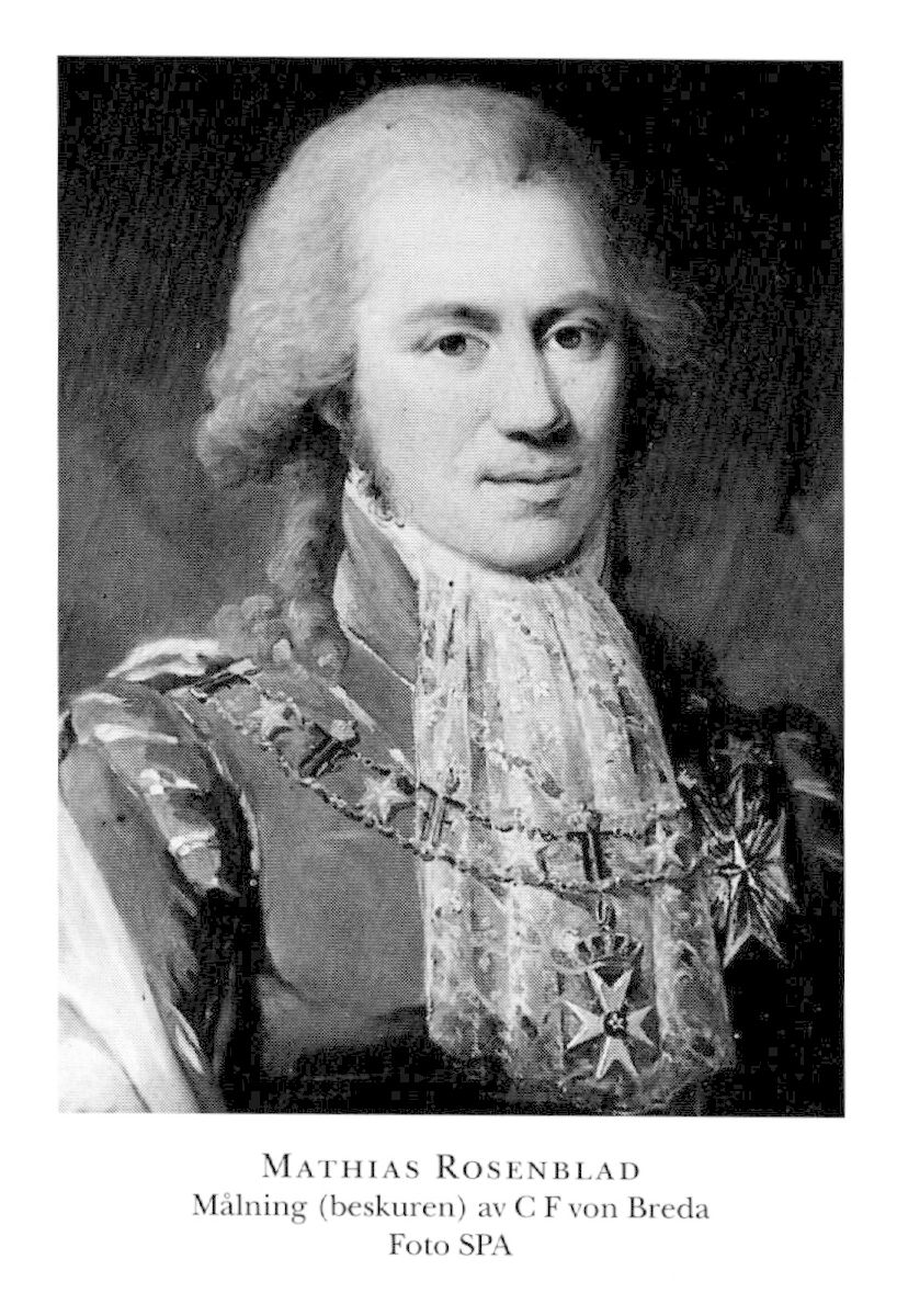 1 Rosenblad (till 1770 Rosén), Mathias, f 23 juni 1758 i Lund, d 4 sept 1847 i Ekerö, Sth. Föräldrar: professorn Eberhard R o Ulrika Eleonora v Hermansson. Inskr vid LU 26 jan 64, jur ex där 21 maj 75, e o kanslist i Justitierevisionen 31 okt 75, kopist där 13 aug 76, kanslist vid Generalauditörsexp 7 maj 77, deltog i riksdagarna 78–89 o 00–30, sekr hos Justitiekanslern 80–84, prot:sekr i Justitierevisionen 30 dec 80, tf revisionssekr där 20 april 85, led av Ecklesiastikberedn 1 nov 86, av Nummerlotteridir 6 jan 87, ordf där 17 sept 05, generalauditör o tf justitiekansler 4 aug 92, statssekr vid Inrikescivilexp 22 aug 92–9 juni 09, chef för Hovexp 94, ombud i Riksgäldskontoret 10 nov 96, frih 1 mars 05, led av finanskomm sept 08, statsråd 9 juni 09, led av komm ang ny kansliordn juli–aug 09, ordf i komm ang granskn av storskiftes- o enskiftesförfattn:arna april 10-juni 12, en av rikets herrar 29 okt 10, led av förberedande lagkomm nov 10–febr 11, granskande led av lagkomm febr 11, ordf i komm ang skråförfattn:arnas överseende sept 12–maj 16, i komm ang tullförfattn:arnas överseende dec 12-mars 17, i Generaltulldir 23 dec 12–24, led av komm ang Guadeloupes besittn:tagande mars–sept 13, ordf för Sveriges kommissarier till stortinget 19 sept–4 nov 14, greve 7 jan 15, led av komm ang handelstraktater med Ryssland o USA maj 15–april 16, ordf i komm ang ny lantmäteriförordn juli 15–okt 17, led av finanskomm:erna 17 o 22, v kansler vid K M:ts Orden 3 juli 23, kansler där från 14 mars 38, led av komm ang handelsförhållandena mellan Sverige o Norge april 24–april 25, tf riksmarskalk 1 juni–1 okt 24, tf generaltulldir 15 nov 26–maj 27, led av komm ang uppehållande av bankosedlarnas värde jan 27, ordf i komm ang sjukvårdens förbättrande i Sthlm febr–okt 27, i dir över Civilstatens pensionsinrättn 28, justitiestatsminister 31 aug 29–6 febr 40, led av komm ang lönereglering inom K M:ts kansli dec 34–april 35. – LVA 97 (preses 00, 07 o 39–40), HedLVHAA 05, HedLVVS 06, LMA 08, Serafimerriddare 25 nov 11, HedLLA 12, jur utriusque hedersdrvid UU 15 juni 18.