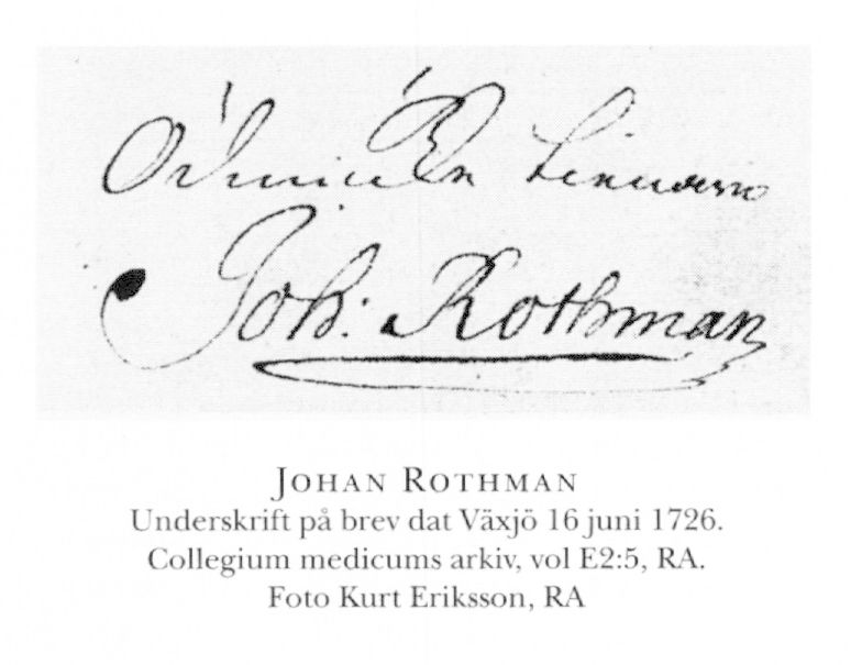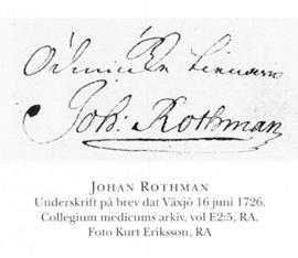 1 Rothman, Johan Stensson, f 24 febr 1684 i Växjö (Hedlund, s 70; fdb saknas), d 20 juli 1763 där. Föräldrar: kyrkoherden Sten Svensson R o Anna Choraea. Elev vid Växjö skola o gymn 92–03, inskr vid UU 7 okt 03, MK vid Collegium medicum 21 sept 10, e o pestläk i Sthlm okt 10, kommenderad till Flottan periodvis 11–13, MD vid univ i Harderwijk, Holland, 28 dec 13, inskr vid univ i Leiden, där, mars 14, led av Collegium medicum 10 nov 14, provinsialläk i Växjö nov 14–22 febr 55, lektor i logik o fysik vid gymn där nov 14 (tilltr 20)–51, assessors fullm i Collegium medicum 11 juni 22.