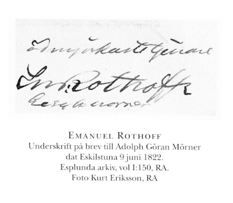 4 Rothoff, Emanuel, son till R 3, f 12 juli 1788 i Eskilstuna, d 25 maj 1832 där. Inskr vid UU 14 okt 96, hovrättsex 19 april 06, bergsex där ht 08, auskultant i Bergskoll 16 dec 08, elev i masmästeriet på Jernkontorets stat 10, v notarie i Bergskoll 1 mars 11, geschworners fullm där 25 maj 13, stipendiat i kemi på Jernkontorets stat 1 mars 14–15 dec 23, förlagsman för Fristaden i Eskilstuna från 19, led av komm till överseende av bergsförfattn:arna dec 22–jan 31, ombud i Uddeholms bruk från 23, led av dir över Karl Gustavs stads gevärsfaktori o Eskilstuna fristad från 24, adelsman vid faderns död 31. – LVA 15, LLA 17.