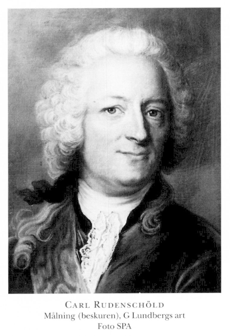 2 Rudenschöld, Carl, före adl Rudeen, son till R 1, f 12 okt 1698 i Åbo (egen uppg), d 10 juni 1783 i Sthlm, Klara. Inskr vid Abo akad 08, vid UU 9 sept 13, utsedd att medfölja Thure Gabriel Bielkes (bd 4) beskickn till Wien 11 maj 19, adl jämte sina syskon för faderns förtjänster 23 maj 19, kanslist hos ambassadör Erik Sparre i Paris 19, kanslist på stat vid den sv beskickn till kongressen i Braunschweig 31 maj 20–22, kansliex 22, e o kanslijunkare 27 april 22, medföljde Axel Wrede Sparre o senare C G Tessin på bildningsresor till Leipzig, Wien o Lunéville i Lothringen 22–27, sekr vid Gustaf Zülichs ambassad till Polen 9 maj 29, ord kanslijunkare 20 maj 29, chargé d'affaires 18 dec 32, ministre plénipotentiaire 23 april 33–19 juli 34, deltog i riksdagarna 34, 38–39, 46–47, 51–52, 55–56 o 60–62 (led av SU 38–39, 55–56 o 60–62, av mindre sekreta deput 55–56), minister ablegatus med hovråds karaktär dec 34–38, minister i Berlin 2 april 39, kansliråd o e o envoyé 22 okt 41, statssekr i utrikesexp 22 april 47, frih 16 dec 47, sekr vid KMO 17 april 48–27 nov 58, led av dir för Lappmarkens ecklesiastikverk 20 dec 50, hovkansler 9 nov 56, president i Kommerskoll 2 mars 58, riksråd 9 april 61–27 maj 66 o 29 maj 69–12 maj 72, greve 14 maj 70 (ej introd), ordf i Tyska förs:s i Sthlm kyrkoråd från 71, i Uppfostringskommissionen från 21 okt 71, kansler vid UU från 21 okt 71, en av Serafimerlasarettets styresmän från 76. – LVHAA 53, LVA 62 (preses 71 o 79), serafimerriddare 21 nov 63, stiftare o LMA 71, konstituerande o LPS 72, HedLVS 77.