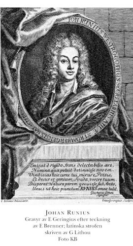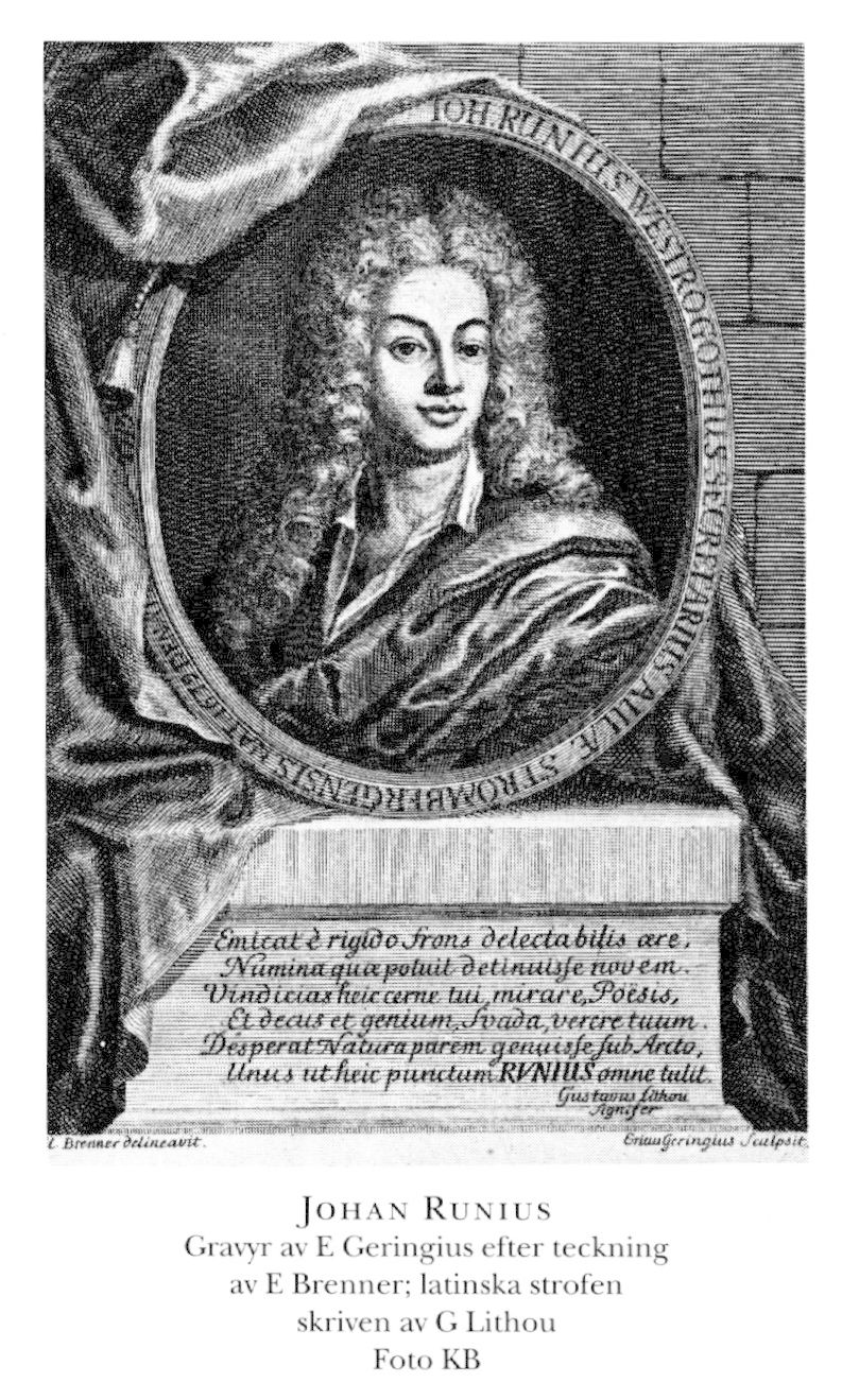 Runius, Johan, f 1679 (möjl 1 juni) i Larv, Skar, d 1 juni 1713 i Sthlm (v Platen, s 37; bet för själaringn 2 juni i Sthlm, Nik). Föräldrar: kh Arvidus R o Annika Levander. Elev vid Skara skola aug 83, vid gymn i Gbg 20 sept 94, inskr vid UU 28 febr 00–02 o 05–06, informator hos överste Gabriel LillieHöök (bd 23, s 98) på Storeberg, Tådene, Skar, 02, hos hovrättsassessorn Magnus Stiernmarck i Sthlm 06, informator o sekr hos generalguvernören Nils Strömberg 07–12. Skald. – Ogift.