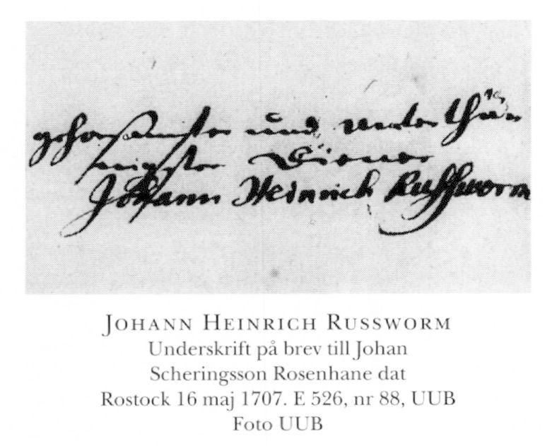 Russworm, Johann Heinrich, dp 25 febr 1679 i Leipzig, Nik, d 10 juni 1731 i Sthlm, Ty ( bouppt; bet för begr 11 juni). Föräldrar: bokhandlaren Michael R o Maria Catharina Jacob. Trol förest för bokhandlaren Johann Michael Rüdigers i Berlin filialer i Mecklenburg, bokhandlare o borgare i Rostock 28 jan 05, universitetsbokhandlare i Uppsala från 1 aug 21, bokhandlare även i Sthlm från trol 23.