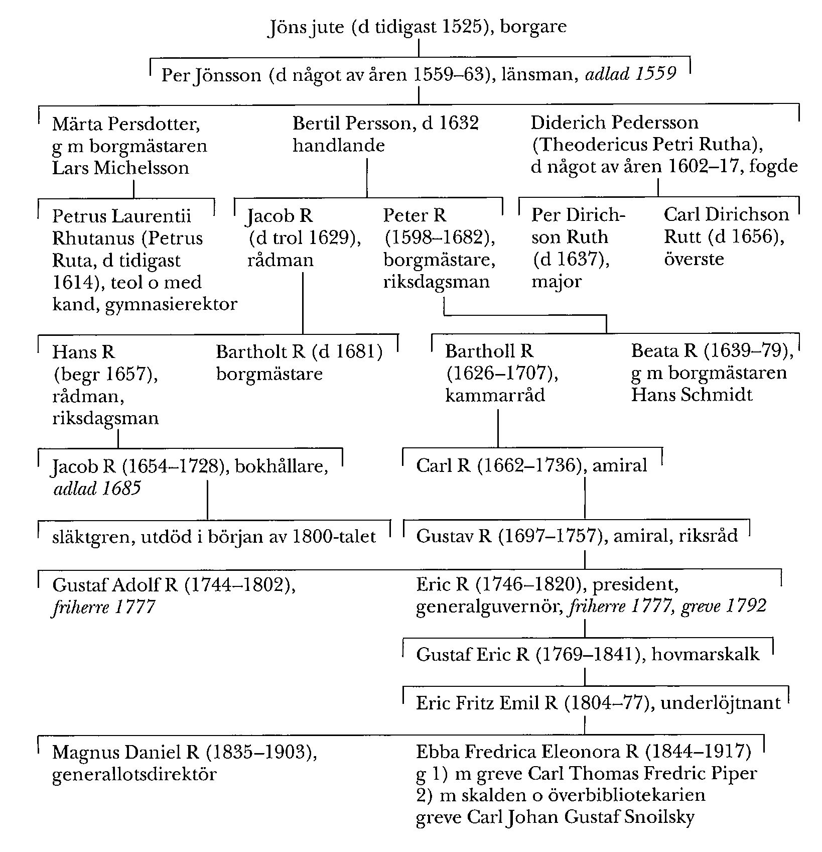 Brorsons son till Diderich Pedersson var borgmästaren i Viborg Bartholt R (d 1681). Hans bror rådmannen där Hans R (begr 1657), som var riksdagsman 1650, blev far till bokhållaren i Tjärukompaniet i Sthlm Jacob R (1654–1728), som adlades 1685 och blev stamfar för en släktgren som dog ut i början av 1800-talet.