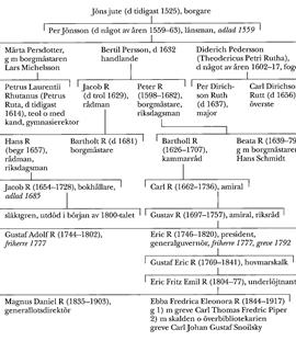 Per Jönssons dotter Märta Persdotter blev i äktenskap med borgmästaren i Hfors Lars Michelsson mor till söner som tog namn efter sin mödernesläkts vapen. En av dem, sedermera teol och med kand Petrus Laurentii Rhutanus (d tidigast 1614), kallades "Petrus Ruta Helsingforsensis Finlandus" vid sin inskrivning vid universitetet i Helmstädt 1589 och har också identifierats (Ramsay; Melander; Callmer; annorlunda Walde) med en "Petrus Rutanus Finlandus nobilis", som inskrevs vid Rostocks universitet 1607. Efter att ha varit privatlärare för bl a hertigar av Sachsen-Lauenburg och sedermera generalguvernören och riksrådet Bengt Oxenstierna (bd 28, s 476) blev han gymnasierektor i Parchim i Mecklenburg. Han författade även latinska dikter och gravskrifter.