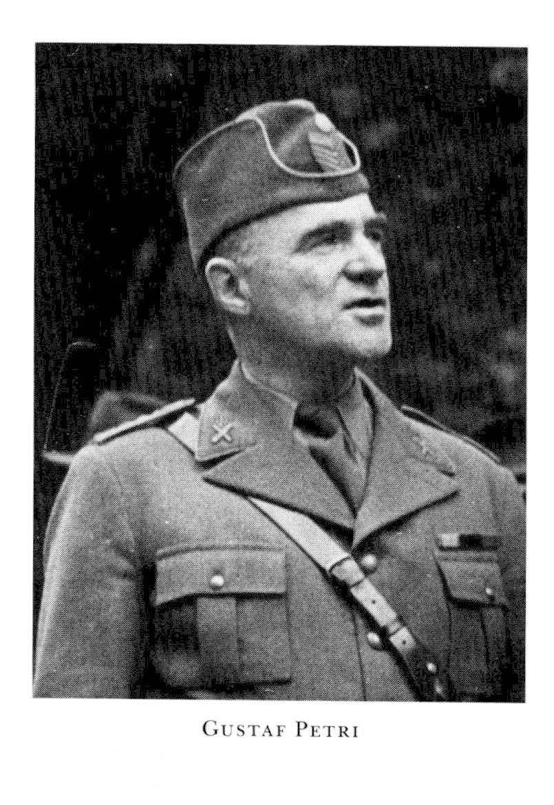 Petri, Gustaf Vilhelm, f 5 jan 1885 i Linköping, d 2 sept 1964 i Täby, Sth. Föräldrar: konsistorienotarien Herman August P o Andrietta Maria Christina Linder. Mogenhetsex vid H a l i Linköping vt 03, volontär vid Andra Göta art:reg 1 juni 03, vid Första livgrenadjärreg 04, officersex vid Krigsskolan 29 nov 05, underlöjtn vid Första livgrenadjärreg 15 dec 05, löjtn av 2 kl där 4 dec 08, elev vid Krigshögskolan 10–12, tjänstg i Lantförsvarsdep nov 13–14, bitr lär i krigskonst o topografi vid Krigsskolans officerskurs 16 okt 15–17 o 15 okt 21–22, andre lär 15 okt 22–26, förste lär där 14 okt 26–31, kapten av 2 kl vid Första livgrenadjärreg 24 jan 19, tjänstg vid Generalstabens krigshist avd 15 okt 19–21, led av styr för Karolinska förb 27, v ordf där 40–61, kapten vid Livgrenadjärreg 1 jan 28, major i armén 1 nov 29, led av styr för Sv hist fören 30, ordf där 57–58, major vid Bohusläns reg 9 juni 31, sakk i 1930 års försvarskommission 31–35, major vid Generalstaben 28 maj (beslut 28 april) 33 o avd:chef för krigshist avd där, överstelöjtn i Generalstaben 27 april 34, överste där 7 okt 36, chef för Krigsskolan 1 juli 37–15 april 40, led av 1939 års rekryteringsutredn jan–dec 39, ordf i 1940 års hemvärnskomm febr–mars 40, beordrad att anordna en hemvärnsorganisation 15 april 40, chef för Hemvärnet 1 juli 40–31 mars 47, ordf i 1945 års hemvärnskomm febr 45–sept 46, generalmajor 1 jan 46. – LKrVA 26, LSkS 28, fil hedersdr vid StH 30 maj 50. – Ogift.