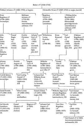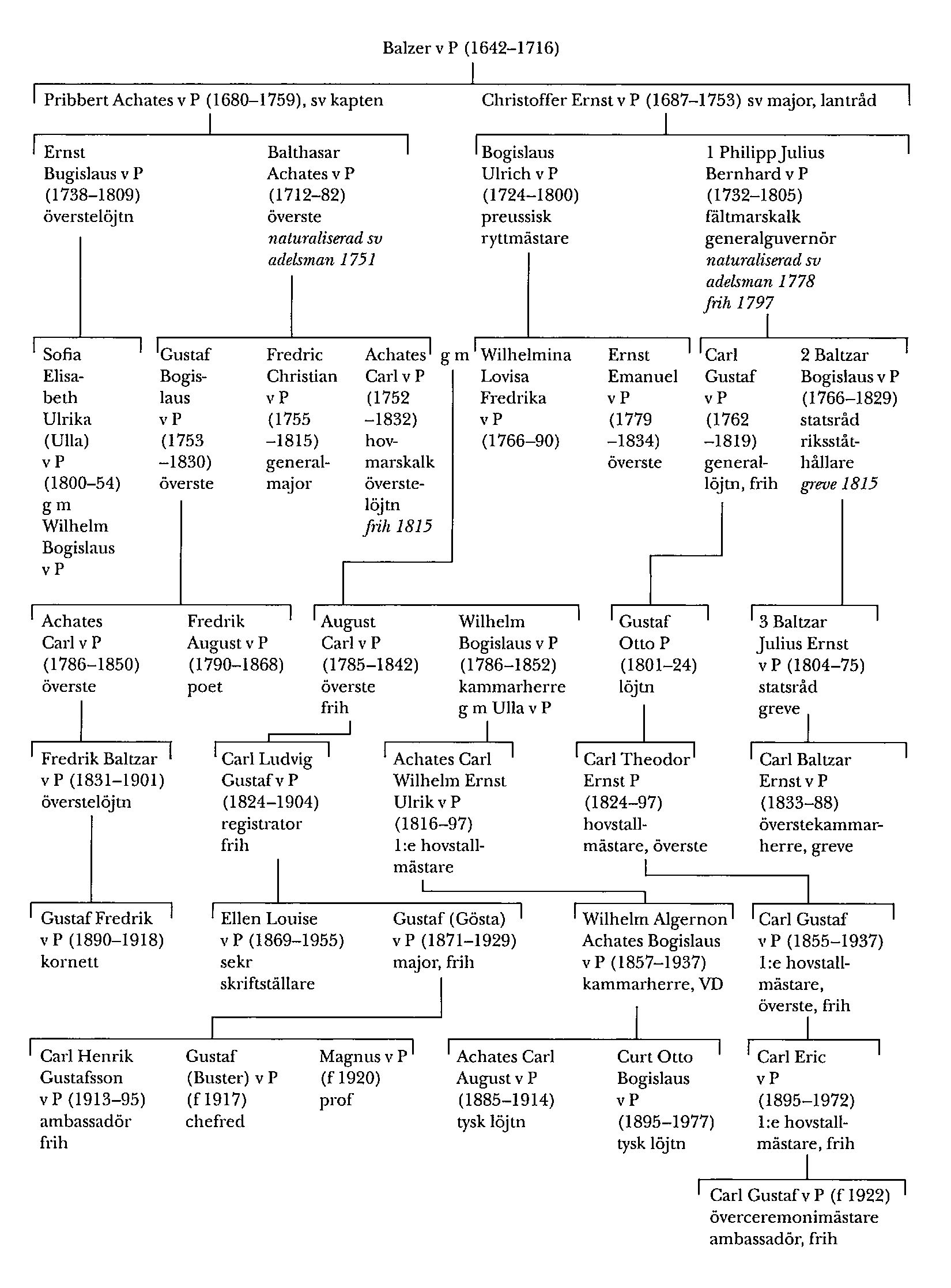 Han blev farfar till översten i sv tjänst Ernst Emanuel v P (1779–1834) och far till dennes farbror översten, sedermera fältmarskalken och generalguvernören Philipp Julius Bernhard v P (P 1), vilken naturaliserades som sv adelsman 1778 och blev friherre 1797. Dennes son statsrådet, sedermera ståthållaren i Norge Baltzar Bogislaus v P (P 2) blev greve 1815 enligt 37 § RF och far till statsrådet Baltzar Julius Ernst v P (P 3). Den grevliga släktgrenen dog ut med den sistnämndes son överstekammarherren Carl Baltzar Ernst v P (1833–88) på Stora Sundby i Öja sn i Södermanland. Carl v P deltog i de sista ståndsriksdagarna. Hans "avfall" från motståndare till anhängare av representationsreformen vid riksdagen 1865–66 blev ett pikant och smått skandalomsusat ämne för kommentarer. Senare var v P riksdagsman i FK 1874–82.